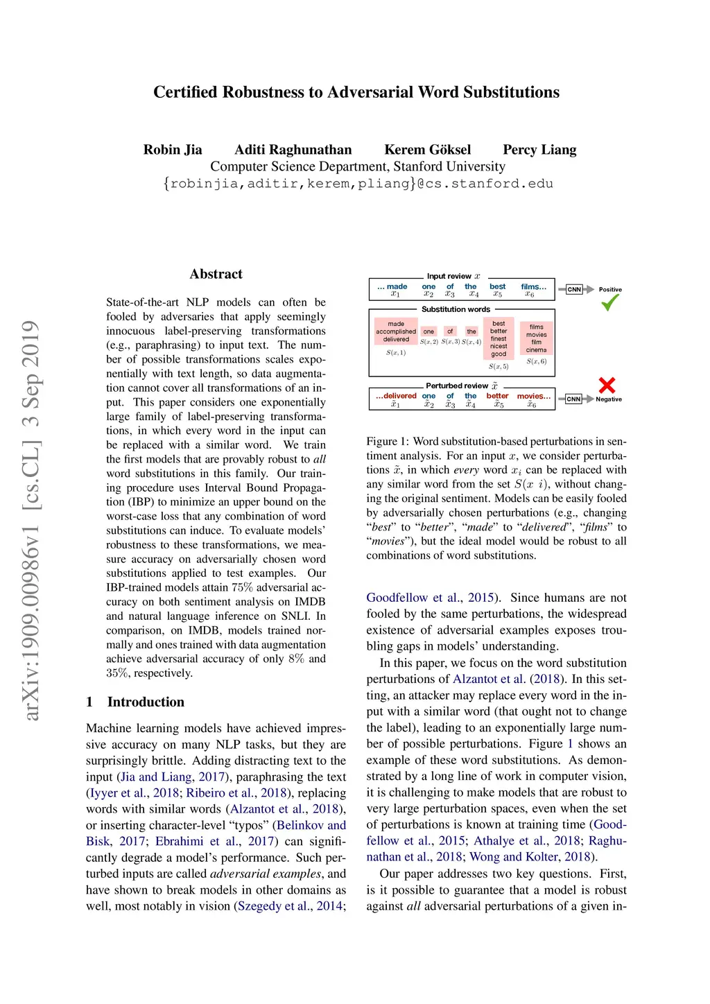 Certified Robustness to Adversarial Word Substitutions