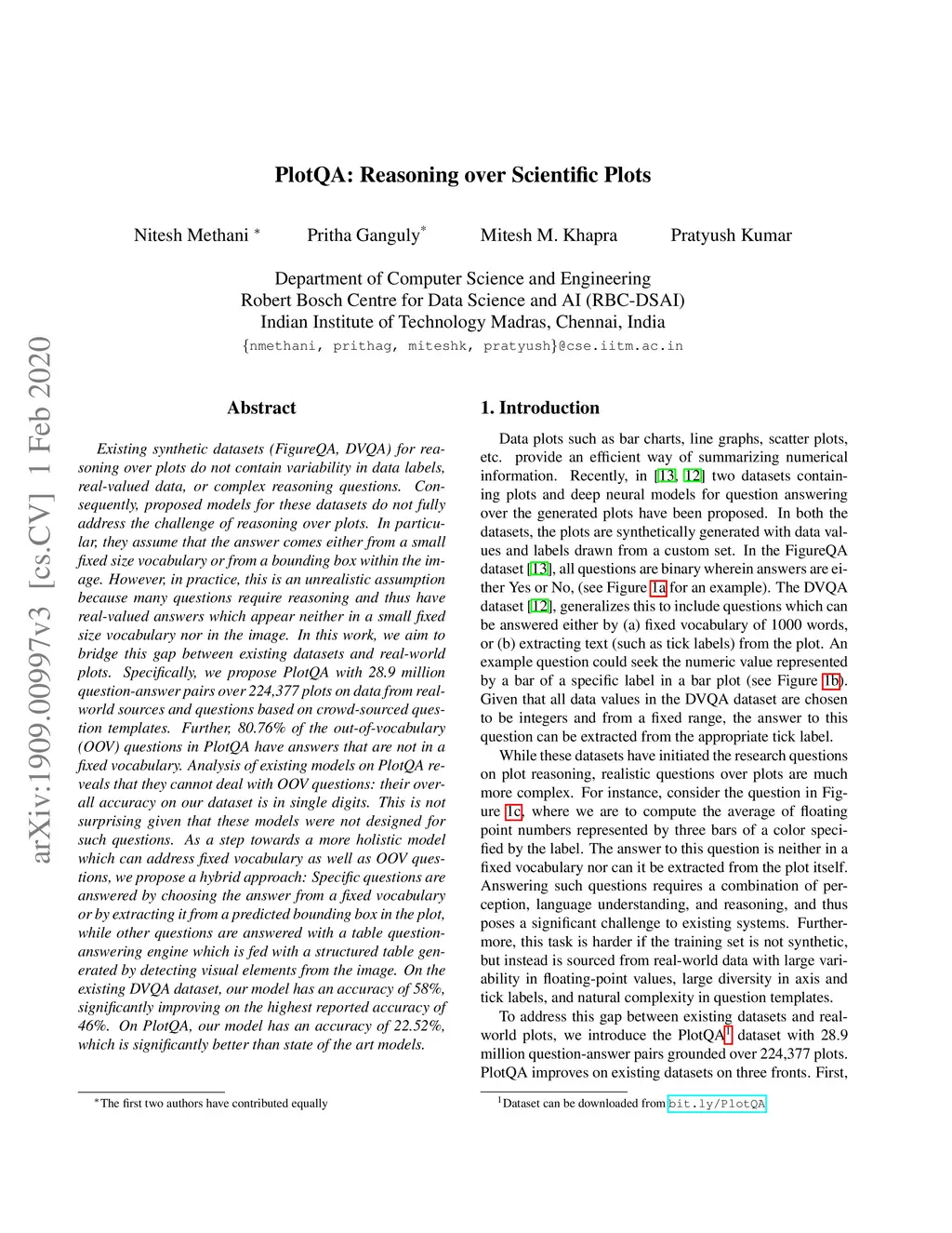 PlotQA: Reasoning over Scientific Plots