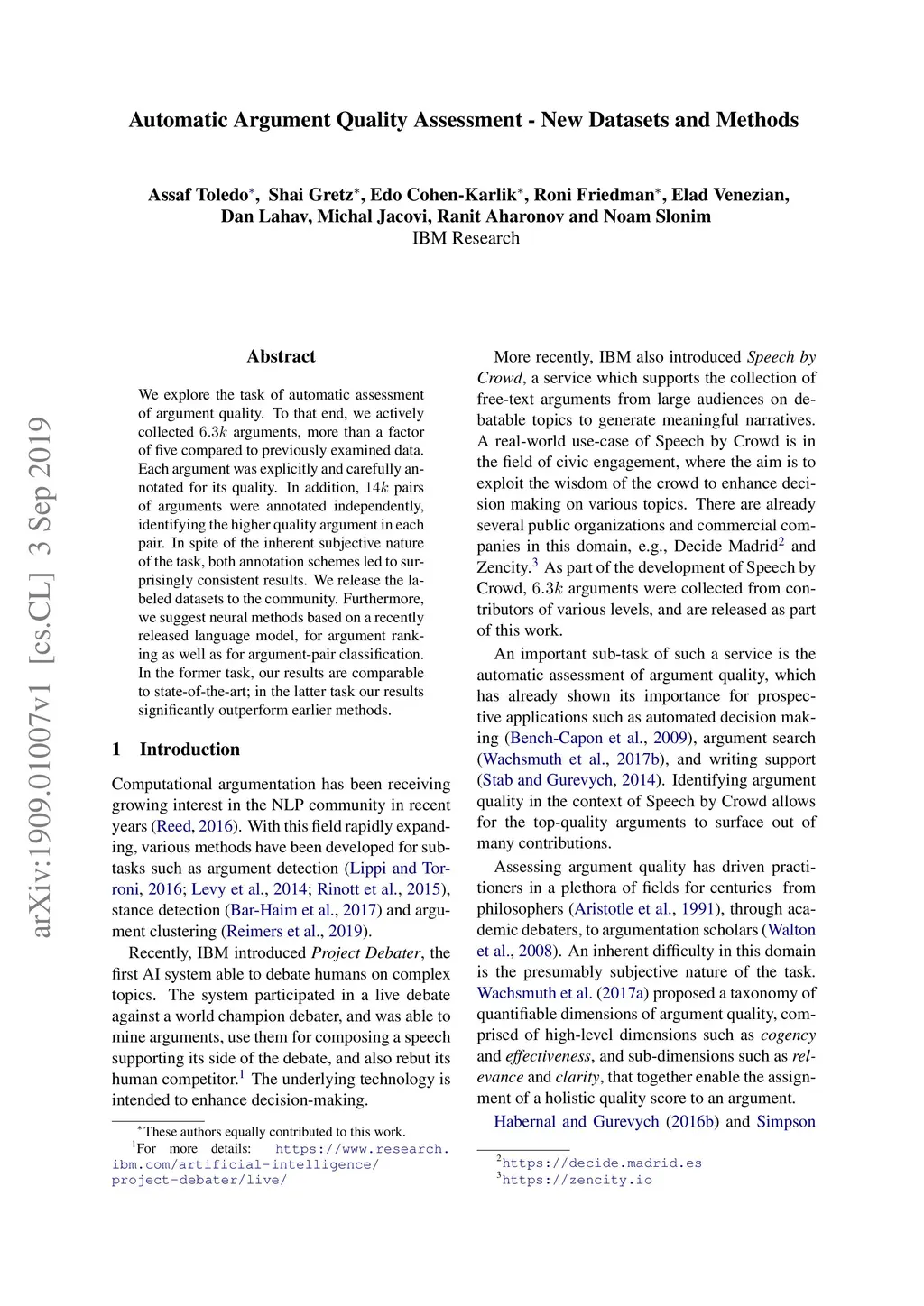 We explore the task of automatic assessment of argument quality. To that end, we actively collected 6.3k arguments, more than a factor of five compared to previously examined data. Each argument was explicitly and carefully annotated for its quality. In addition, 14k pairs of arguments were annotated independently, identifying the higher quality argument in each pair. In spite of the inherent subjective nature of the task, both annotation schemes led to surprisingly consistent results. We release the labeled datasets to the community. Furthermore, we suggest neural methods based on a recently released language model, for argument ranking as well as for argument-pair classification. In the former task, our results are comparable to state-of-the-art; in the latter task our results significantly outperform earlier methods.