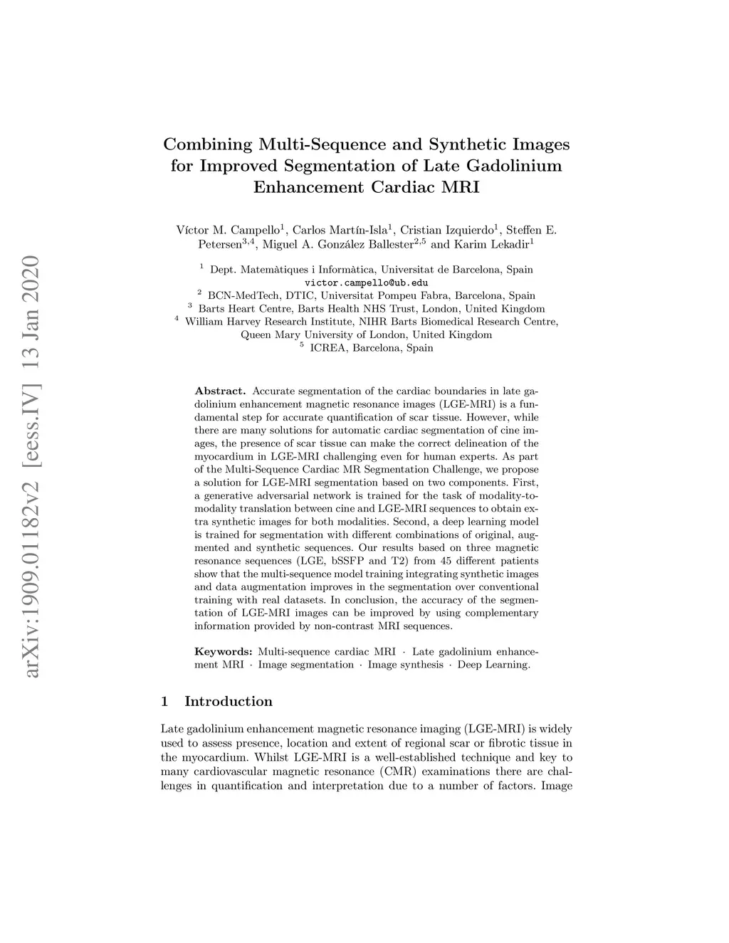Accurate segmentation of the cardiac boundaries in late gadolinium enhancement magnetic resonance images (LGE-MRI) is a fundamental step for accurate quantification of scar tissue. However, while there are many solutions for automatic cardiac segmentation of cine images, the presence of scar tissue can make the correct delineation of the myocardium in LGE-MRI challenging even for human experts. As part of the Multi-Sequence Cardiac MR Segmentation Challenge, we propose a solution for LGE-MRI segmentation based on two components. First, a generative adversarial network is trained for the task of modality-to-modality translation between cine and LGE-MRI sequences to obtain extra synthetic images for both modalities. Second, a deep learning model is trained for segmentation with different combinations of original, augmented and synthetic sequences. Our results based on three magnetic resonance sequences (LGE, bSSFP and T2) from 45 different patients show that the multi-sequence model training integrating synthetic images and data augmentation improves in the segmentation over conventional training with real datasets. In conclusion, the accuracy of the segmentation of LGE-MRI images can be improved by using complementary information provided by non-contrast MRI sequences.