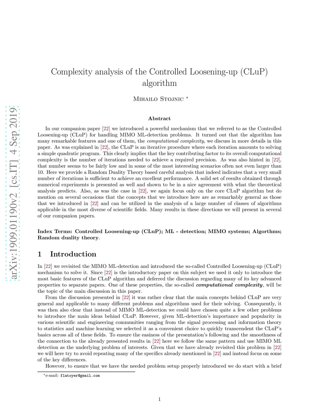 In our companion paper \cite{Stojnicclupint19} we introduced a powerful mechanism that we referred to as the Controlled Loosening-up (CLuP) for handling MIMO ML-detection problems. It turned out that the algorithm has many remarkable features and one of them, the \emph{computational complexity}, we discuss in more details in this paper. As was explained in \cite{Stojnicclupint19}, the CLuP is an iterative procedure where each iteration amounts to solving a simple quadratic program. This clearly implies that the key contributing factor to its overall computational complexity is the number of iterations needed to achieve a required precision. As was also hinted in \cite{Stojnicclupint19}, that number seems to be fairly low and in some of the most interesting scenarios often not even larger than . Here we provide a Random Duality Theory based careful analysis that indeed indicates that a very small number of iterations is sufficient to achieve an excellent performance. A solid set of results obtained through numerical experiments is presented as well and shown to be in a nice agreement with what the theoretical analysis predicts. Also, as was the case in \cite{Stojnicclupint19}, we again focus only on the core CLuP algorithm but do mention on several occasions that the concepts that we introduce here are as remarkably general as those that we introduced in \cite{Stojnicclupint19} and can be utilized in the analysis of a large number of classes of algorithms applicable in the most diverse of scientific fields. Many results in these directions we will present in several of our companion papers.
