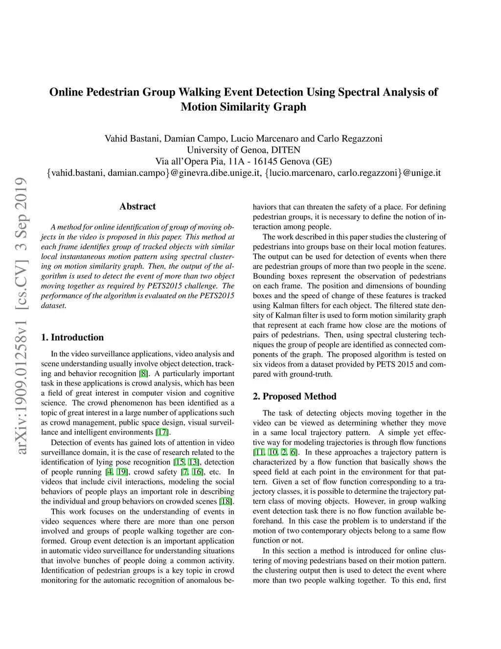 A method for online identification of group of moving objects in the video is proposed in this paper. This method at each frame identifies group of tracked objects with similar local instantaneous motion pattern using spectral clustering on motion similarity graph. Then, the output of the algorithm is used to detect the event of more than two object moving together as required by PETS2015 challenge. The performance of the algorithm is evaluated on the PETS2015 dataset.