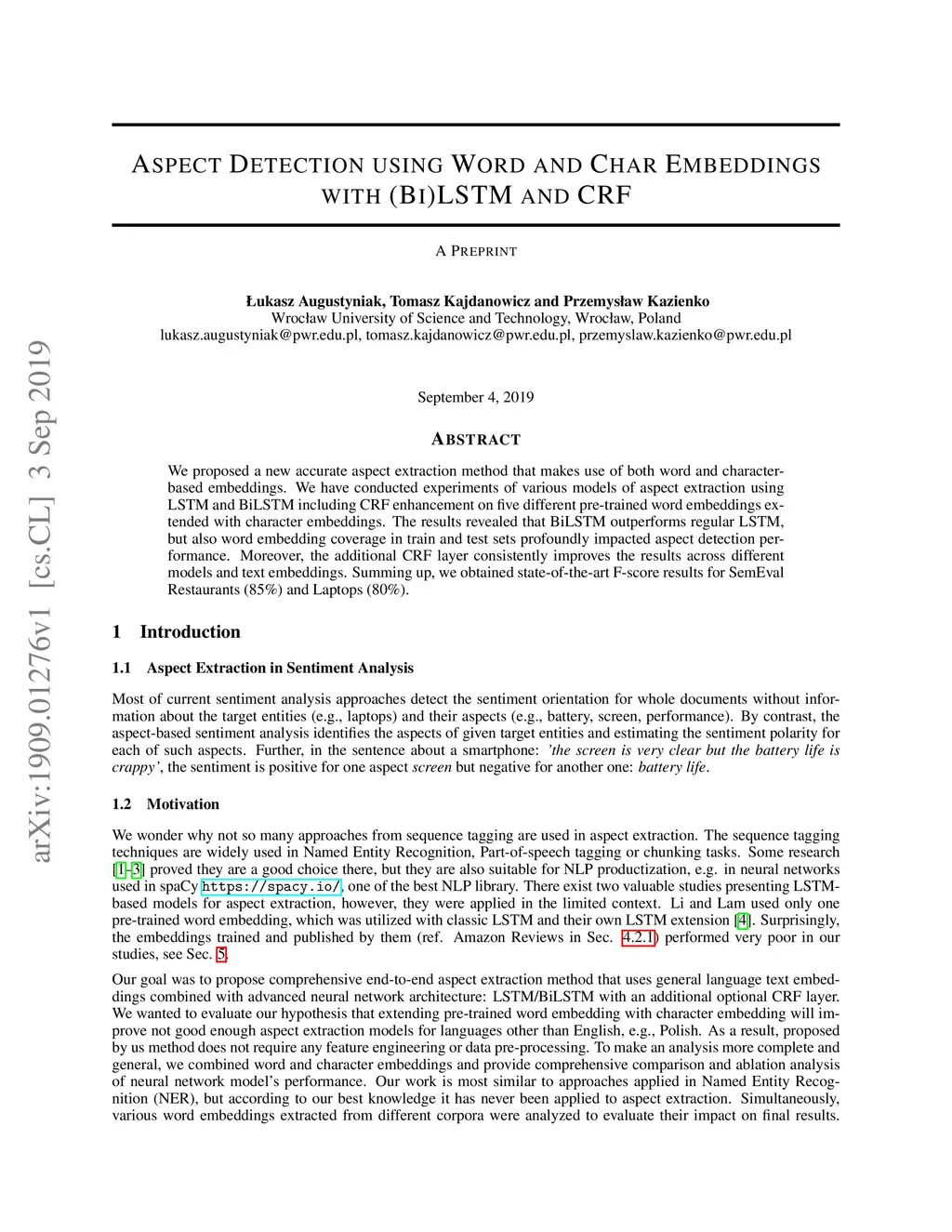 We proposed a~new accurate aspect extraction method that makes use of both word and character-based embeddings. We have conducted experiments of various models of aspect extraction using LSTM and BiLSTM including CRF enhancement on five different pre-trained word embeddings extended with character embeddings. The results revealed that BiLSTM outperforms regular LSTM, but also word embedding coverage in train and test sets profoundly impacted aspect detection performance. Moreover, the additional CRF layer consistently improves the results across different models and text embeddings. Summing up, we obtained state-of-the-art F-score results for SemEval Restaurants (85%) and Laptops (80%).