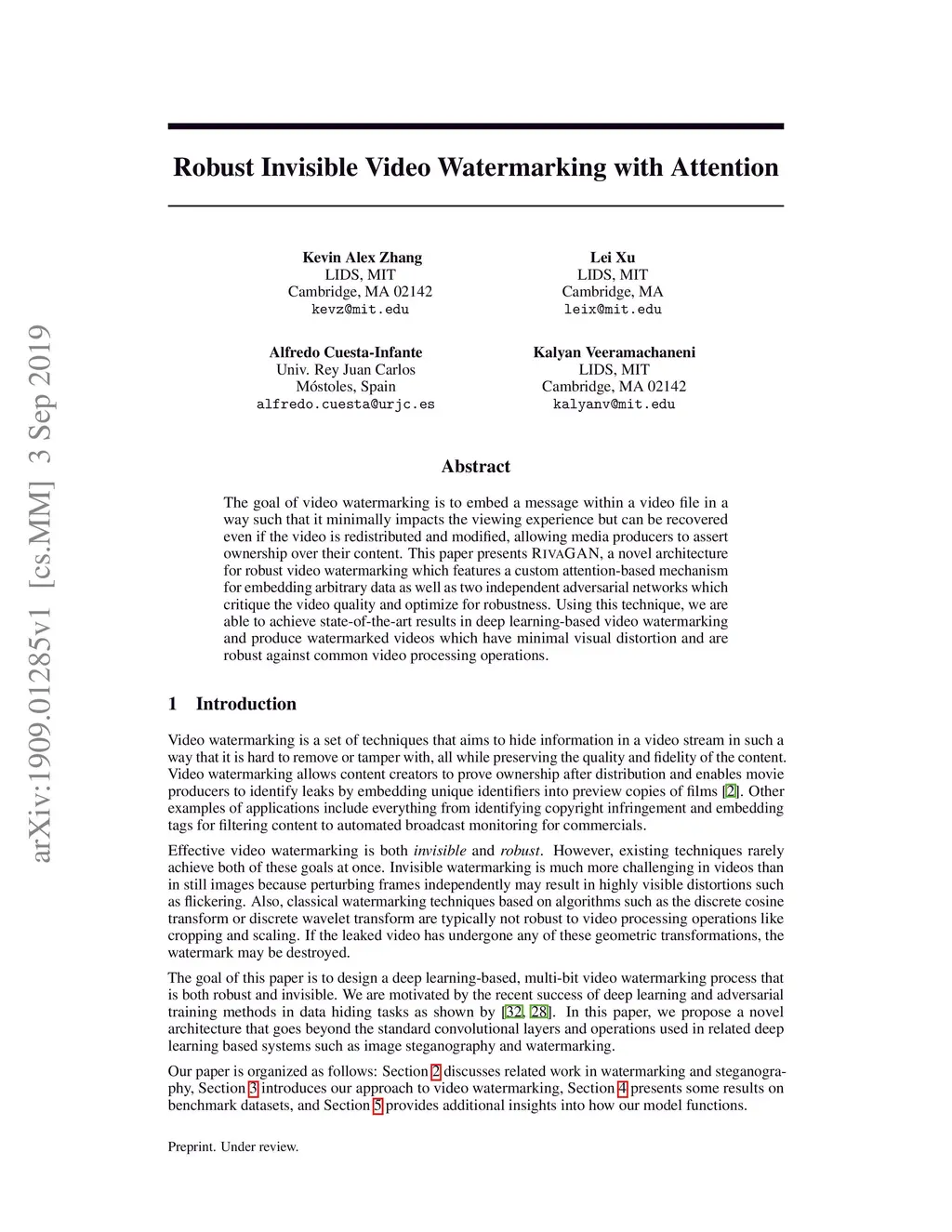 The goal of video watermarking is to embed a message within a video file in a way such that it minimally impacts the viewing experience but can be recovered even if the video is redistributed and modified, allowing media producers to assert ownership over their content. This paper presents RivaGAN, a novel architecture for robust video watermarking which features a custom attention-based mechanism for embedding arbitrary data as well as two independent adversarial networks which critique the video quality and optimize for robustness. Using this technique, we are able to achieve state-of-the-art results in deep learning-based video watermarking and produce watermarked videos which have minimal visual distortion and are robust against common video processing operations.