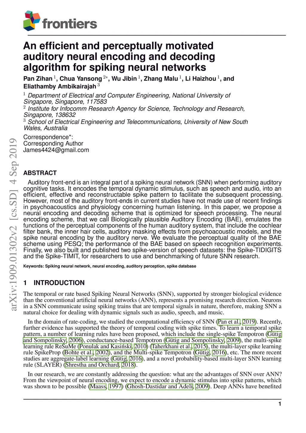 Auditory front-end is an integral part of a spiking neural network (SNN) when performing auditory cognitive tasks. It encodes the temporal dynamic stimulus, such as speech and audio, into an efficient, effective and reconstructable spike pattern to facilitate the subsequent processing. However, most of the auditory front-ends in current studies have not made use of recent findings in psychoacoustics and physiology concerning human listening. In this paper, we propose a neural encoding and decoding scheme that is optimized for speech processing. The neural encoding scheme, that we call Biologically plausible Auditory Encoding (BAE), emulates the functions of the perceptual components of the human auditory system, that include the cochlear filter bank, the inner hair cells, auditory masking effects from psychoacoustic models, and the spike neural encoding by the auditory nerve. We evaluate the perceptual quality of the BAE scheme using PESQ; the performance of the BAE based on speech recognition experiments. Finally, we also built and published two spike-version of speech datasets: the Spike-TIDIGITS and the Spike-TIMIT, for researchers to use and benchmarking of future SNN research.