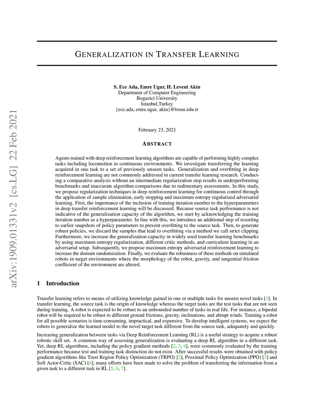 Agents trained with deep reinforcement learning algorithms are capable of performing highly complex tasks including locomotion in continuous environments. We investigate transferring the learning acquired in one task to a set of previously unseen tasks. Generalization and overfitting in deep reinforcement learning are not commonly addressed in current transfer learning research. Conducting a comparative analysis without an intermediate regularization step results in underperforming benchmarks and inaccurate algorithm comparisons due to rudimentary assessments. In this study, we propose regularization techniques in deep reinforcement learning for continuous control through the application of sample elimination, early stopping and maximum entropy regularized adversarial learning. First, the importance of the inclusion of training iteration number to the hyperparameters in deep transfer reinforcement learning will be discussed. Because source task performance is not indicative of the generalization capacity of the algorithm, we start by acknowledging the training iteration number as a hyperparameter. In line with this, we introduce an additional step of resorting to earlier snapshots of policy parameters to prevent overfitting to the source task. Then, to generate robust policies, we discard the samples that lead to overfitting via a method we call strict clipping. Furthermore, we increase the generalization capacity in widely used transfer learning benchmarks by using maximum entropy regularization, different critic methods, and curriculum learning in an adversarial setup. Subsequently, we propose maximum entropy adversarial reinforcement learning to increase the domain randomization. Finally, we evaluate the robustness of these methods on simulated robots in target environments where the morphology of the robot, gravity, and tangential friction coefficient of the environment are altered.