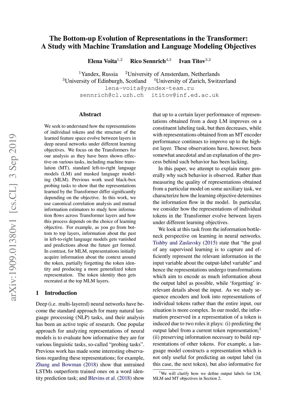 We seek to understand how the representations of individual tokens and the structure of the learned feature space evolve between layers in deep neural networks under different learning objectives. We focus on the Transformers for our analysis as they have been shown effective on various tasks, including machine translation (MT), standard left-to-right language models (LM) and masked language modeling (MLM). Previous work used black-box probing tasks to show that the representations learned by the Transformer differ significantly depending on the objective. In this work, we use canonical correlation analysis and mutual information estimators to study how information flows across Transformer layers and how this process depends on the choice of learning objective. For example, as you go from bottom to top layers, information about the past in left-to-right language models gets vanished and predictions about the future get formed. In contrast, for MLM, representations initially acquire information about the context around the token, partially forgetting the token identity and producing a more generalized token representation. The token identity then gets recreated at the top MLM layers.
