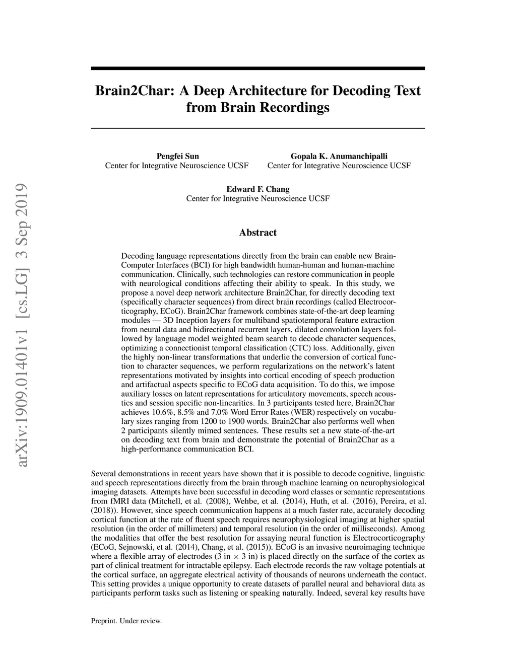 Brain2Char: A Deep Architecture for Decoding Text from Brain Recordings