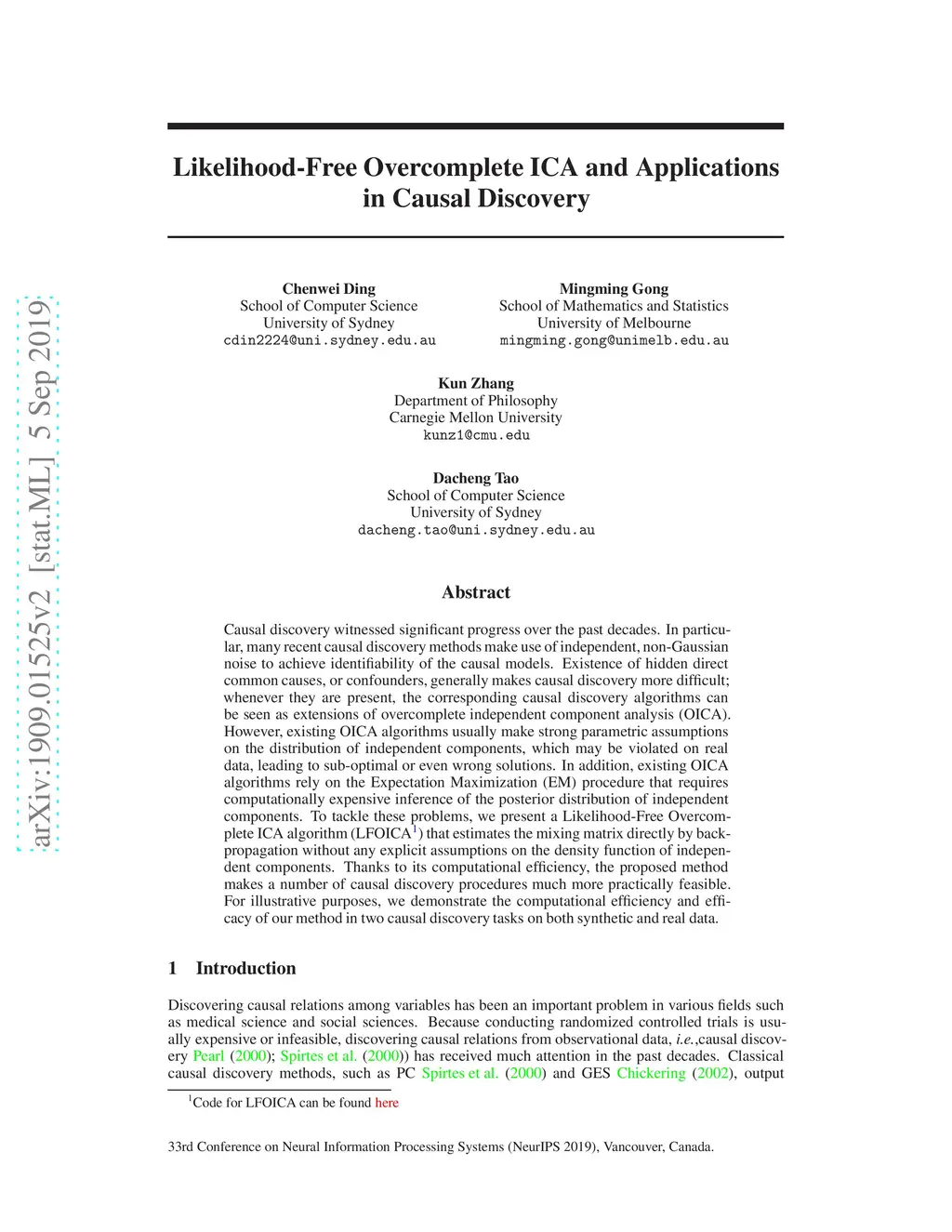Causal discovery witnessed significant progress over the past decades. In particular, many recent causal discovery methods make use of independent, non-Gaussian noise to achieve identifiability of the causal models. Existence of hidden direct common causes, or confounders, generally makes causal discovery more difficult; whenever they are present, the corresponding causal discovery algorithms can be seen as extensions of overcomplete independent component analysis (OICA). However, existing OICA algorithms usually make strong parametric assumptions on the distribution of independent components, which may be violated on real data, leading to sub-optimal or even wrong solutions. In addition, existing OICA algorithms rely on the Expectation Maximization (EM) procedure that requires computationally expensive inference of the posterior distribution of independent components. To tackle these problems, we present a Likelihood-Free Overcomplete ICA algorithm (LFOICA) that estimates the mixing matrix directly by back-propagation without any explicit assumptions on the density function of independent components. Thanks to its computational efficiency, the proposed method makes a number of causal discovery procedures much more practically feasible. For illustrative purposes, we demonstrate the computational efficiency and efficacy of our method in two causal discovery tasks on both synthetic and real data.