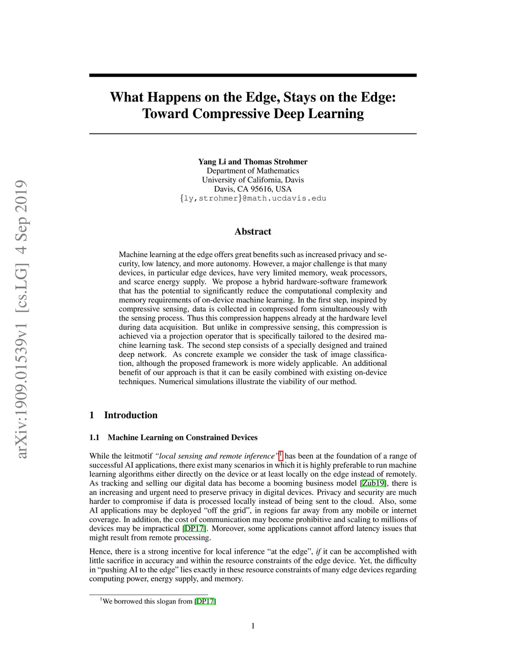 Machine learning at the edge offers great benefits such as increased privacy and security, low latency, and more autonomy. However, a major challenge is that many devices, in particular edge devices, have very limited memory, weak processors, and scarce energy supply. We propose a hybrid hardware-software framework that has the potential to significantly reduce the computational complexity and memory requirements of on-device machine learning. In the first step, inspired by compressive sensing, data is collected in compressed form simultaneously with the sensing process. Thus this compression happens already at the hardware level during data acquisition. But unlike in compressive sensing, this compression is achieved via a projection operator that is specifically tailored to the desired machine learning task. The second step consists of a specially designed and trained deep network. As concrete example we consider the task of image classification, although the proposed framework is more widely applicable. An additional benefit of our approach is that it can be easily combined with existing on-device techniques. Numerical simulations illustrate the viability of our method.