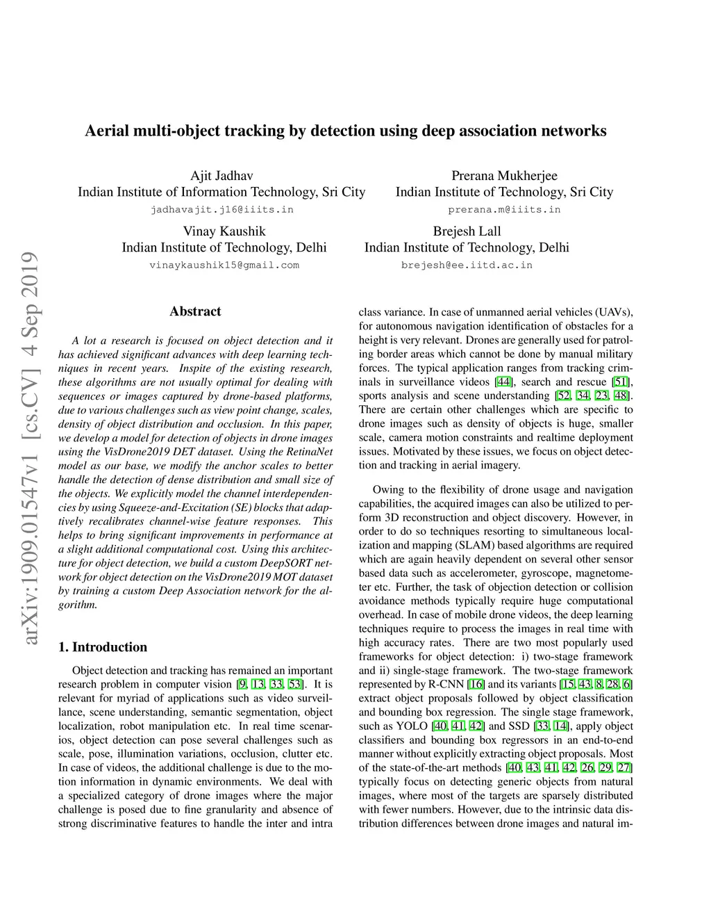 A lot a research is focused on object detection and it has achieved significant advances with deep learning techniques in recent years. Inspite of the existing research, these algorithms are not usually optimal for dealing with sequences or images captured by drone-based platforms, due to various challenges such as view point change, scales, density of object distribution and occlusion. In this paper, we develop a model for detection of objects in drone images using the VisDrone2019 DET dataset. Using the RetinaNet model as our base, we modify the anchor scales to better handle the detection of dense distribution and small size of the objects. We explicitly model the channel interdependencies by using "Squeeze-and-Excitation" (SE) blocks that adaptively recalibrates channel-wise feature responses. This helps to bring significant improvements in performance at a slight additional computational cost. Using this architecture for object detection, we build a custom DeepSORT network for object detection on the VisDrone2019 MOT dataset by training a custom Deep Association network for the algorithm.