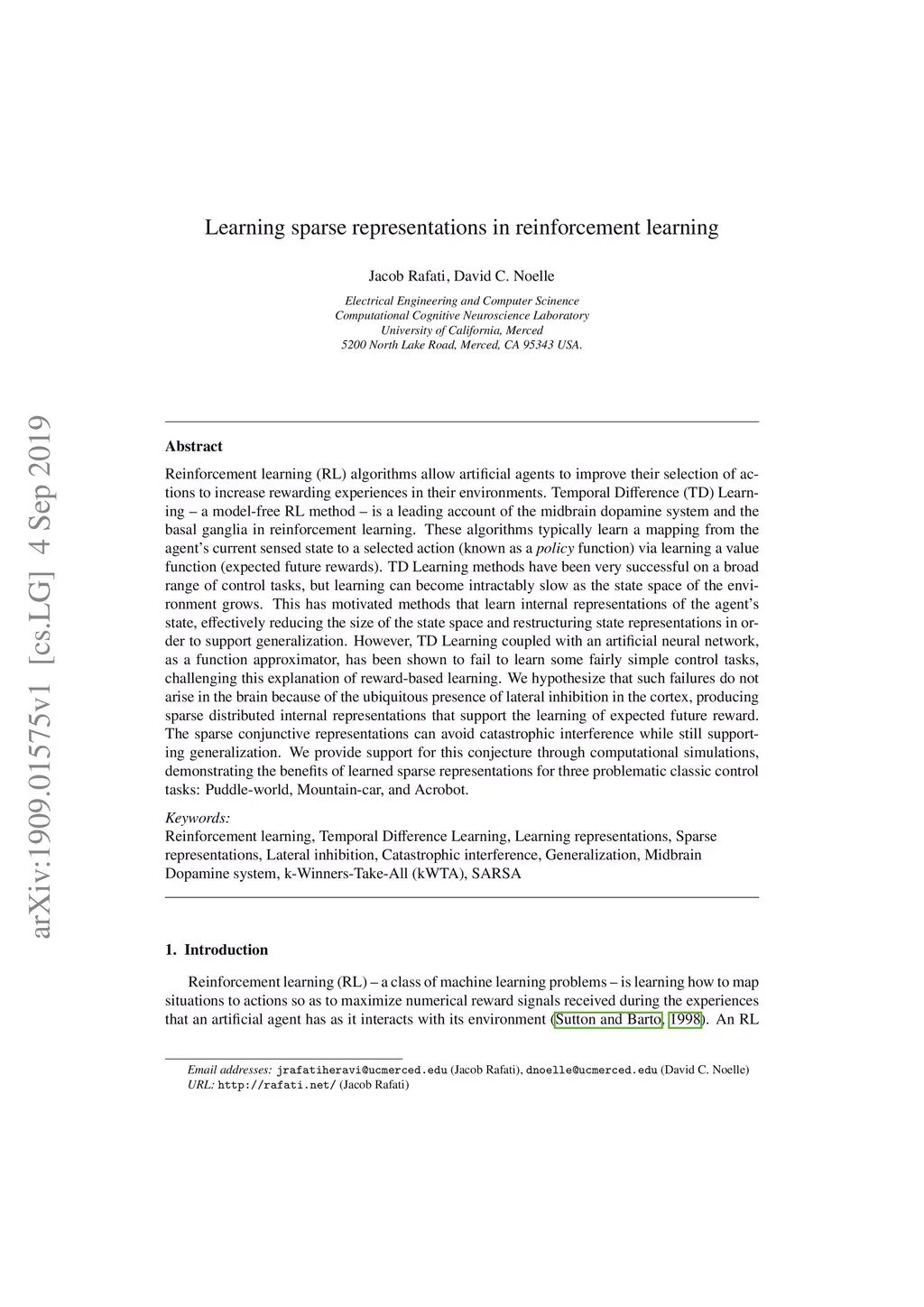 Reinforcement learning (RL) algorithms allow artificial agents to improve their selection of actions to increase rewarding experiences in their environments. Temporal Difference (TD) Learning -- a model-free RL method -- is a leading account of the midbrain dopamine system and the basal ganglia in reinforcement learning. These algorithms typically learn a mapping from the agent's current sensed state to a selected action (known as a policy function) via learning a value function (expected future rewards). TD Learning methods have been very successful on a broad range of control tasks, but learning can become intractably slow as the state space of the environment grows. This has motivated methods that learn internal representations of the agent's state, effectively reducing the size of the state space and restructuring state representations in order to support generalization. However, TD Learning coupled with an artificial neural network, as a function approximator, has been shown to fail to learn some fairly simple control tasks, challenging this explanation of reward-based learning. We hypothesize that such failures do not arise in the brain because of the ubiquitous presence of lateral inhibition in the cortex, producing sparse distributed internal representations that support the learning of expected future reward. The sparse conjunctive representations can avoid catastrophic interference while still supporting generalization. We provide support for this conjecture through computational simulations, demonstrating the benefits of learned sparse representations for three problematic classic control tasks: Puddle-world, Mountain-car, and Acrobot.
