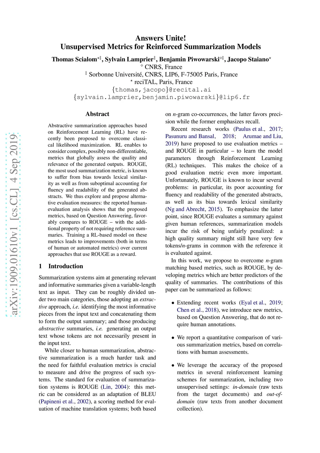 Answers Unite! Unsupervised Metrics for Reinforced Summarization Models