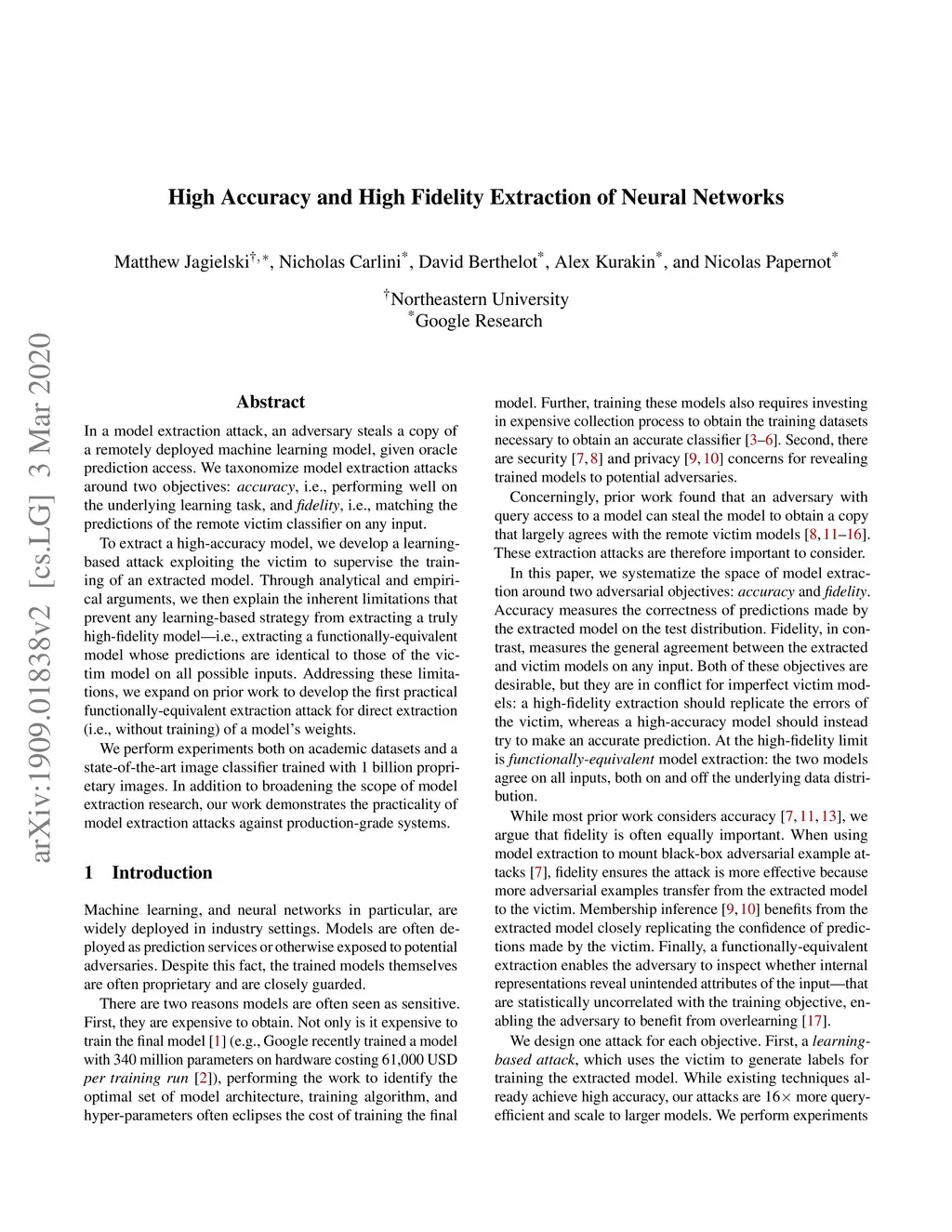 In a model extraction attack, an adversary steals a copy of a remotely deployed machine learning model, given oracle prediction access. We taxonomize model extraction attacks around two objectives: *accuracy*, i.e., performing well on the underlying learning task, and *fidelity*, i.e., matching the predictions of the remote victim classifier on any input. To extract a high-accuracy model, we develop a learning-based attack exploiting the victim to supervise the training of an extracted model. Through analytical and empirical arguments, we then explain the inherent limitations that prevent any learning-based strategy from extracting a truly high-fidelity model---i.e., extracting a functionally-equivalent model whose predictions are identical to those of the victim model on all possible inputs. Addressing these limitations, we expand on prior work to develop the first practical functionally-equivalent extraction attack for direct extraction (i.e., without training) of a model's weights. We perform experiments both on academic datasets and a state-of-the-art image classifier trained with 1 billion proprietary images. In addition to broadening the scope of model extraction research, our work demonstrates the practicality of model extraction attacks against production-grade systems.
