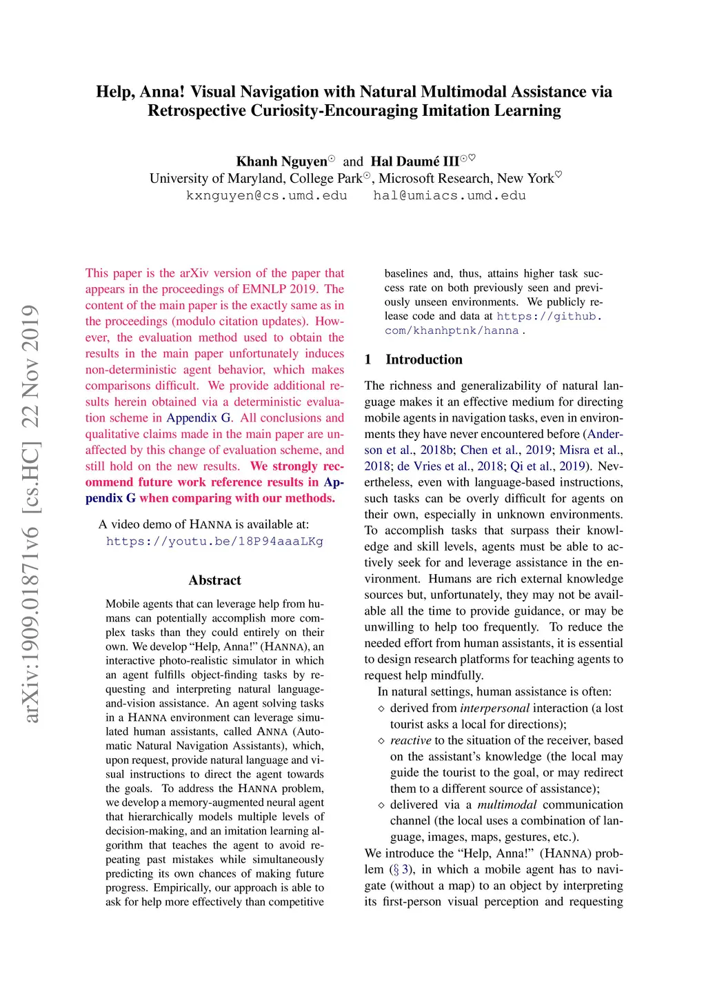 Mobile agents that can leverage help from humans can potentially accomplish more complex tasks than they could entirely on their own. We develop "Help, Anna!" (HANNA), an interactive photo-realistic simulator in which an agent fulfills object-finding tasks by requesting and interpreting natural language-and-vision assistance. An agent solving tasks in a HANNA environment can leverage simulated human assistants, called ANNA (Automatic Natural Navigation Assistants), which, upon request, provide natural language and visual instructions to direct the agent towards the goals. To address the HANNA problem, we develop a memory-augmented neural agent that hierarchically models multiple levels of decision-making, and an imitation learning algorithm that teaches the agent to avoid repeating past mistakes while simultaneously predicting its own chances of making future progress. Empirically, our approach is able to ask for help more effectively than competitive baselines and, thus, attains higher task success rate on both previously seen and previously unseen environments. We publicly release code and data at https://github.com/khanhptnk/hanna . A video demo is available at https://youtu.be/18P94aaaLKg .
