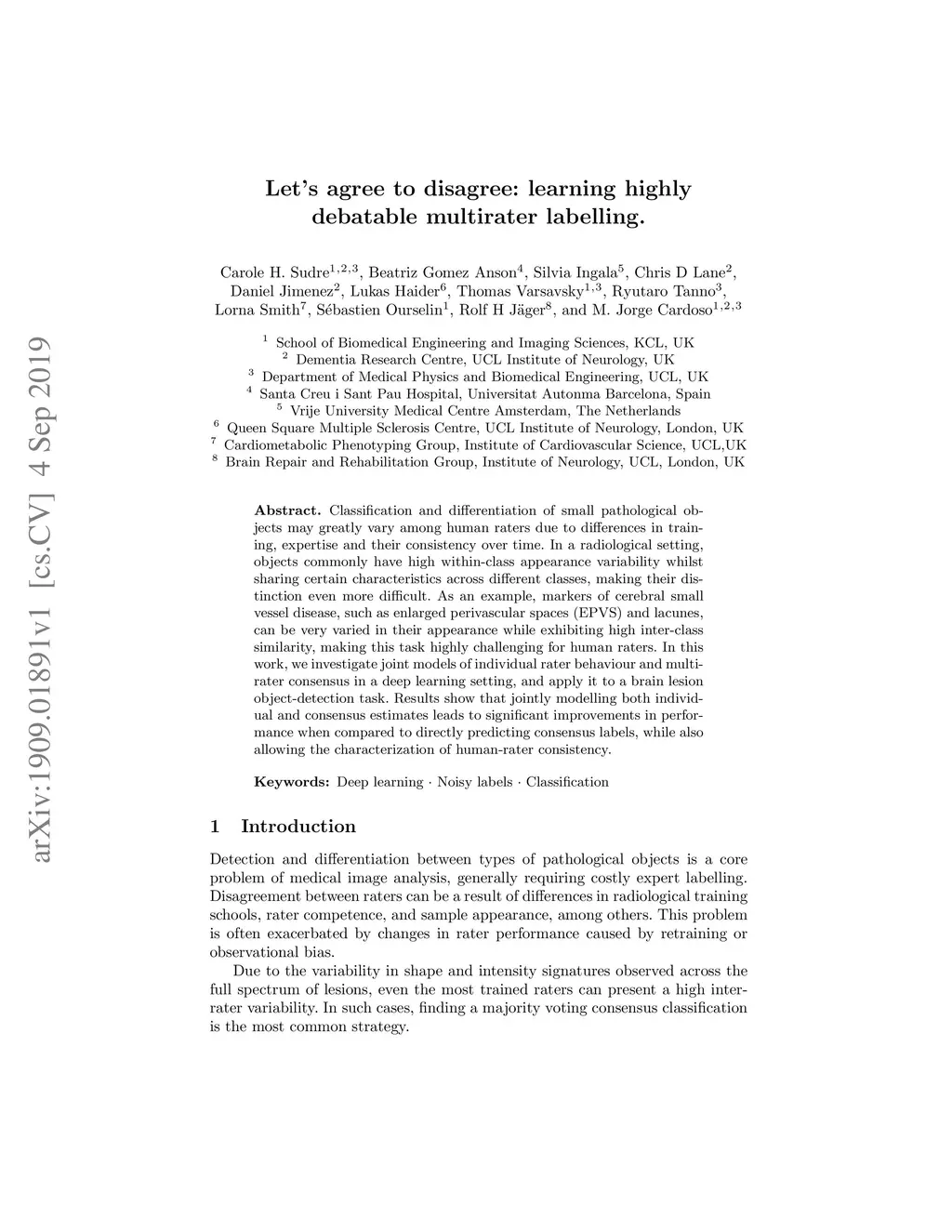 Classification and differentiation of small pathological objects may greatly vary among human raters due to differences in training, expertise and their consistency over time. In a radiological setting, objects commonly have high within-class appearance variability whilst sharing certain characteristics across different classes, making their distinction even more difficult. As an example, markers of cerebral small vessel disease, such as enlarged perivascular spaces (EPVS) and lacunes, can be very varied in their appearance while exhibiting high inter-class similarity, making this task highly challenging for human raters. In this work, we investigate joint models of individual rater behaviour and multirater consensus in a deep learning setting, and apply it to a brain lesion object-detection task. Results show that jointly modelling both individual and consensus estimates leads to significant improvements in performance when compared to directly predicting consensus labels, while also allowing the characterization of human-rater consistency.