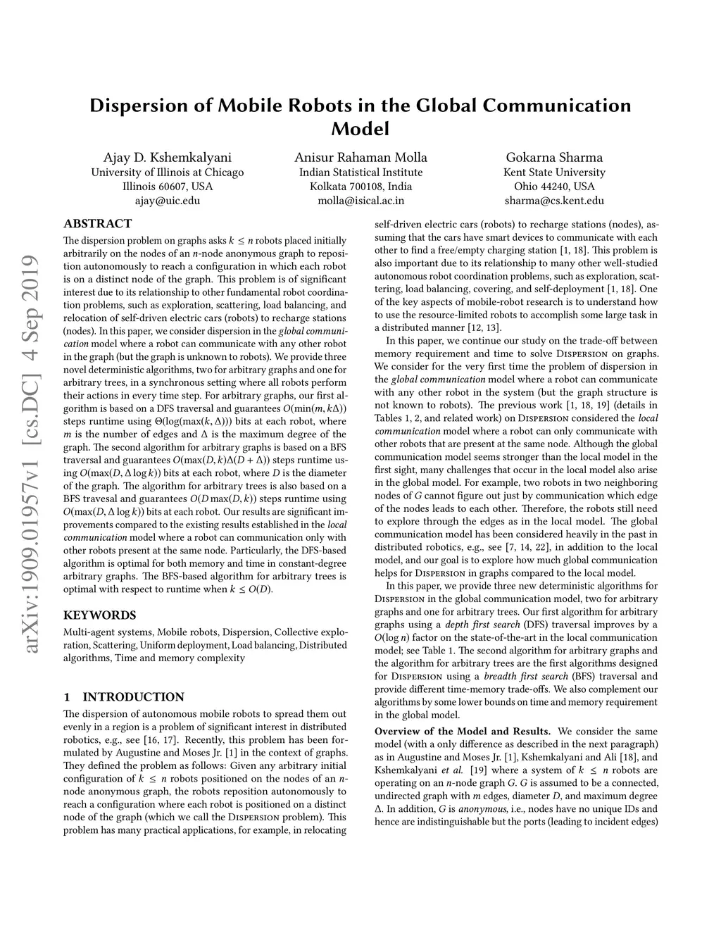 The dispersion problem on graphs asks robots placed initially arbitrarily on the nodes of an -node anonymous graph to reposition autonomously to reach a configuration in which each robot is on a distinct node of the graph. This problem is of significant interest due to its relationship to other fundamental robot coordination problems, such as exploration, scattering, load balancing etc. In this paper, we consider dispersion in the {\em global communication} model where a robot can communicate with any other robot in the graph (but the graph is unknown to robots). We provide three novel deterministic algorithms, two for arbitrary graphs and one for arbitrary trees, in a synchronous setting where all robots perform their actions in every time step. For arbitrary graphs, our first algorithm is based on a DFS traversal and guarantees steps runtime using bits at each robot, where is the number of edges and is the maximum degree of the graph. The second algorithm for arbitrary graphs is based on a BFS traversal and guarantees steps runtime using bits at each robot, where is the diameter of the graph. The algorithm for arbitrary trees is also based on a BFS travesal and guarantees steps runtime using bits at each robot. Our results are significant improvements compared to the existing results established in the {\em local communication} model where a robot can communication only with other robots present at the same node. Particularly, the DFS-based algorithm is optimal for both memory and time in constant-degree arbitrary graphs. The BFS-based algorithm for arbitrary trees is optimal with respect to runtime when .