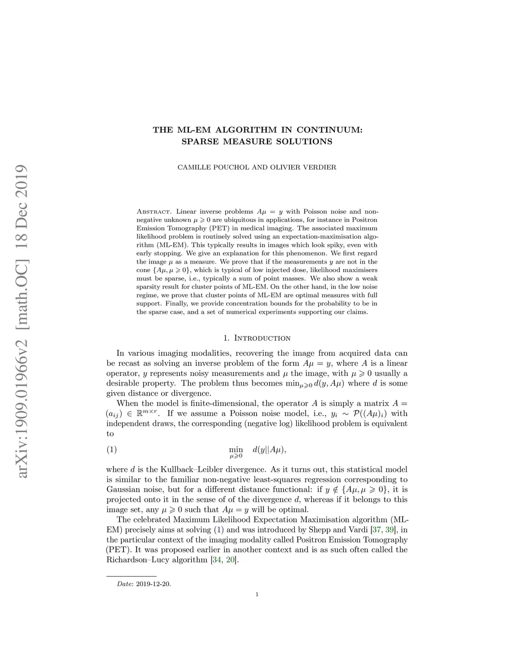 The ML-EM algorithm in continuum: sparse measure solutions