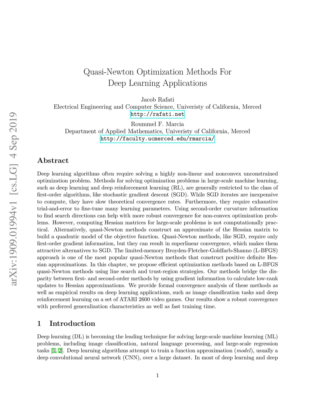 Deep learning algorithms often require solving a highly non-linear and nonconvex unconstrained optimization problem. Methods for solving optimization problems in large-scale machine learning, such as deep learning and deep reinforcement learning (RL), are generally restricted to the class of first-order algorithms, like stochastic gradient descent (SGD). While SGD iterates are inexpensive to compute, they have slow theoretical convergence rates. Furthermore, they require exhaustive trial-and-error to fine-tune many learning parameters. Using second-order curvature information to find search directions can help with more robust convergence for non-convex optimization problems. However, computing Hessian matrices for large-scale problems is not computationally practical. Alternatively, quasi-Newton methods construct an approximate of the Hessian matrix to build a quadratic model of the objective function. Quasi-Newton methods, like SGD, require only first-order gradient information, but they can result in superlinear convergence, which makes them attractive alternatives to SGD. The limited-memory Broyden-Fletcher-Goldfarb-Shanno (L-BFGS) approach is one of the most popular quasi-Newton methods that construct positive definite Hessian approximations. In this chapter, we propose efficient optimization methods based on L-BFGS quasi-Newton methods using line search and trust-region strategies. Our methods bridge the disparity between first- and second-order methods by using gradient information to calculate low-rank updates to Hessian approximations. We provide formal convergence analysis of these methods as well as empirical results on deep learning applications, such as image classification tasks and deep reinforcement learning on a set of ATARI 2600 video games. Our results show a robust convergence with preferred generalization characteristics as well as fast training time.