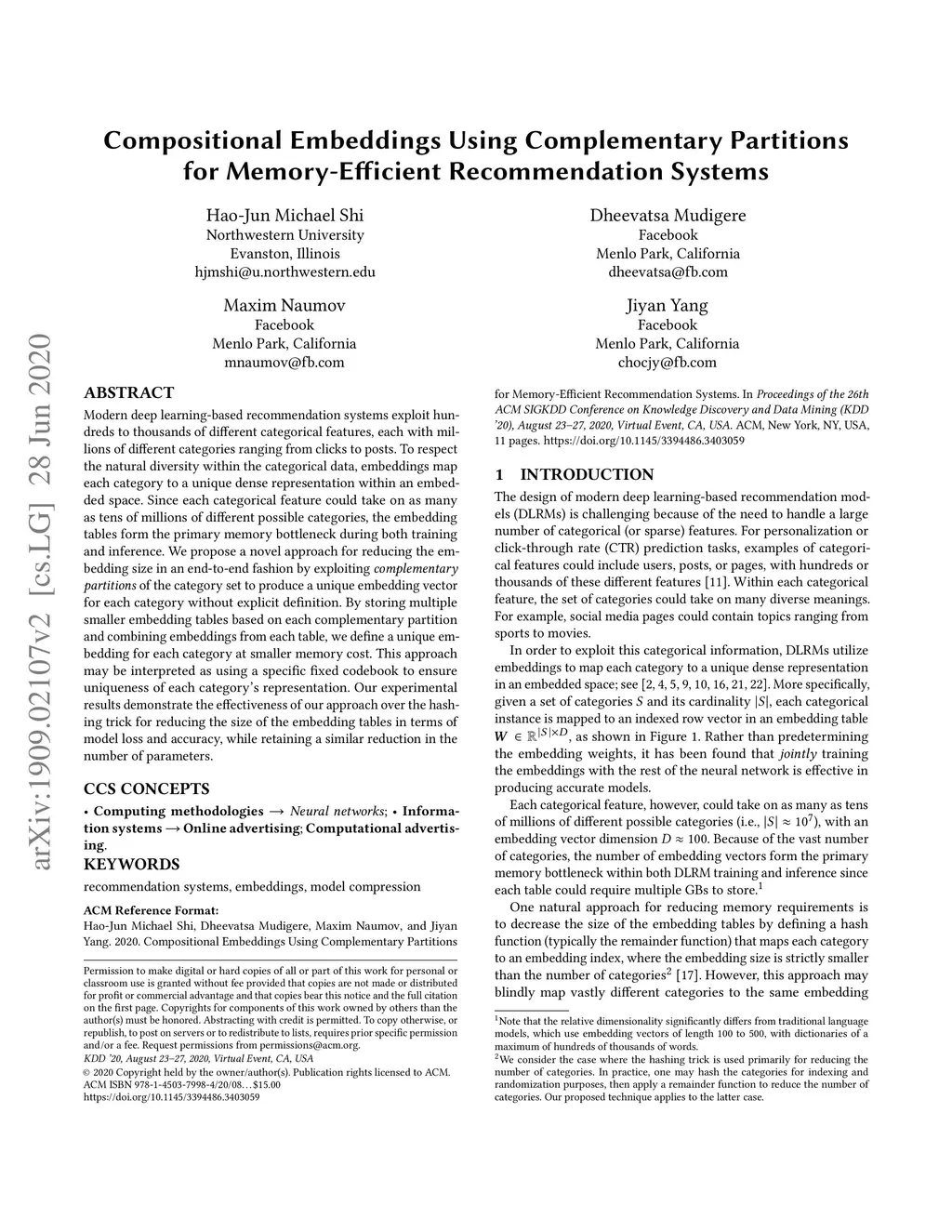 Modern deep learning-based recommendation systems exploit hundreds to thousands of different categorical features, each with millions of different categories ranging from clicks to posts. To respect the natural diversity within the categorical data, embeddings map each category to a unique dense representation within an embedded space. Since each categorical feature could take on as many as tens of millions of different possible categories, the embedding tables form the primary memory bottleneck during both training and inference. We propose a novel approach for reducing the embedding size in an end-to-end fashion by exploiting complementary partitions of the category set to produce a unique embedding vector for each category without explicit definition. By storing multiple smaller embedding tables based on each complementary partition and combining embeddings from each table, we define a unique embedding for each category at smaller memory cost. This approach may be interpreted as using a specific fixed codebook to ensure uniqueness of each category's representation. Our experimental results demonstrate the effectiveness of our approach over the hashing trick for reducing the size of the embedding tables in terms of model loss and accuracy, while retaining a similar reduction in the number of parameters.