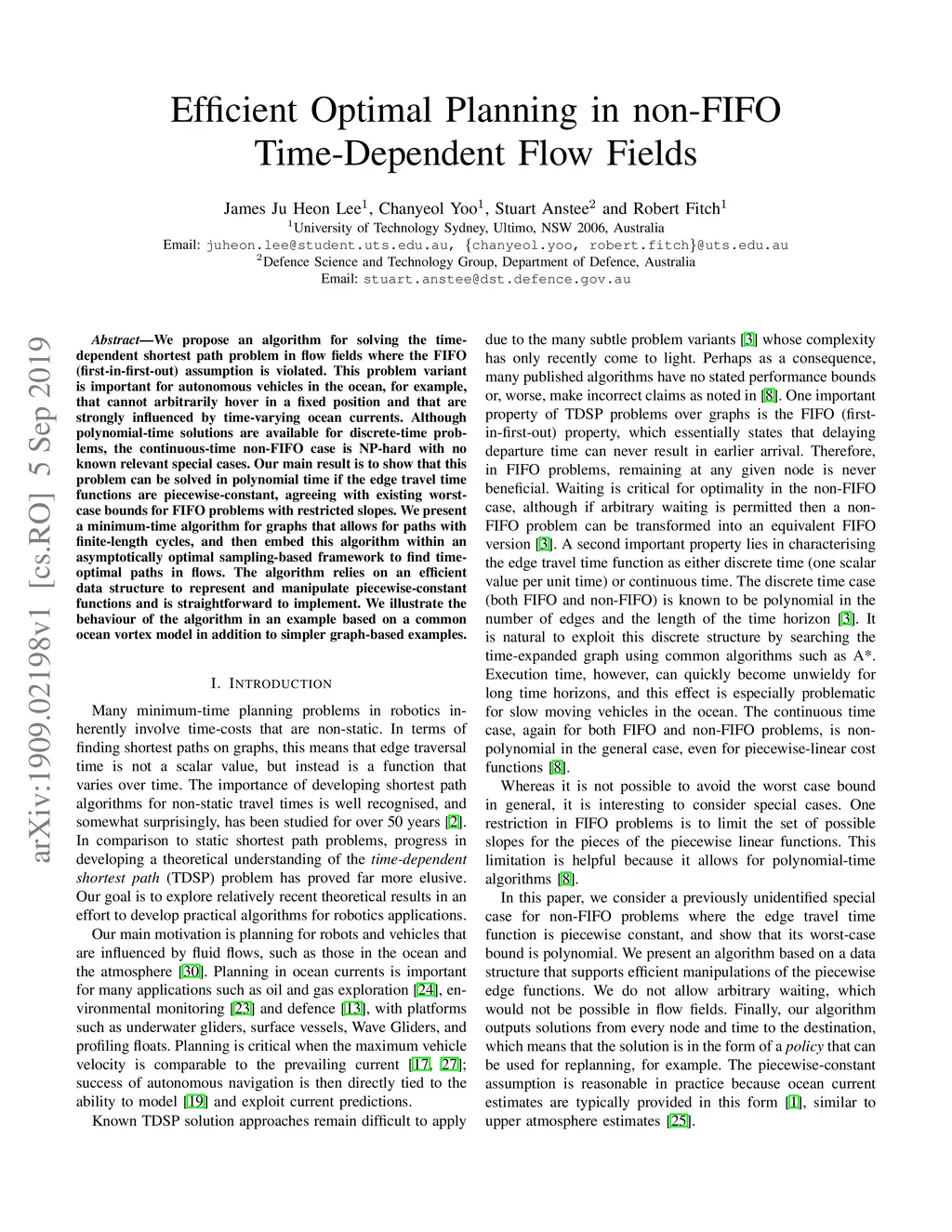 We propose an algorithm for solving the time-dependent shortest path problem in flow fields where the FIFO (first-in-first-out) assumption is violated. This problem variant is important for autonomous vehicles in the ocean, for example, that cannot arbitrarily hover in a fixed position and that are strongly influenced by time-varying ocean currents. Although polynomial-time solutions are available for discrete-time problems, the continuous-time non-FIFO case is NP-hard with no known relevant special cases. Our main result is to show that this problem can be solved in polynomial time if the edge travel time functions are piecewise-constant, agreeing with existing worst-case bounds for FIFO problems with restricted slopes. We present a minimum-time algorithm for graphs that allows for paths with finite-length cycles, and then embed this algorithm within an asymptotically optimal sampling-based framework to find time-optimal paths in flows. The algorithm relies on an efficient data structure to represent and manipulate piecewise-constant functions and is straightforward to implement. We illustrate the behaviour of the algorithm in an example based on a common ocean vortex model in addition to simpler graph-based examples.