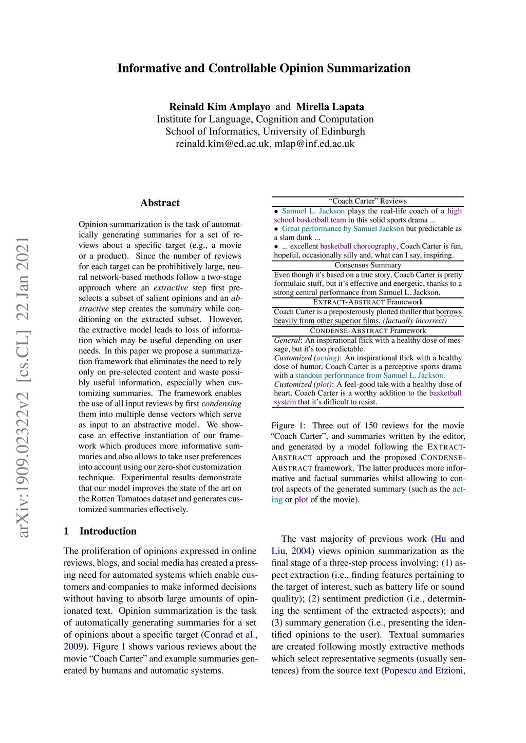 Opinion summarization is the task of automatically generating summaries for a set of reviews about a specific target (e.g., a movie or a product). Since the number of reviews for each target can be prohibitively large, neural network-based methods follow a two-stage approach where an extractive step first pre-selects a subset of salient opinions and an abstractive step creates the summary while conditioning on the extracted subset. However, the extractive model leads to loss of information which may be useful depending on user needs. In this paper we propose a summarization framework that eliminates the need to rely only on pre-selected content and waste possibly useful information, especially when customizing summaries. The framework enables the use of all input reviews by first condensing them into multiple dense vectors which serve as input to an abstractive model. We showcase an effective instantiation of our framework which produces more informative summaries and also allows to take user preferences into account using our zero-shot customization technique. Experimental results demonstrate that our model improves the state of the art on the Rotten Tomatoes dataset and generates customized summaries effectively.