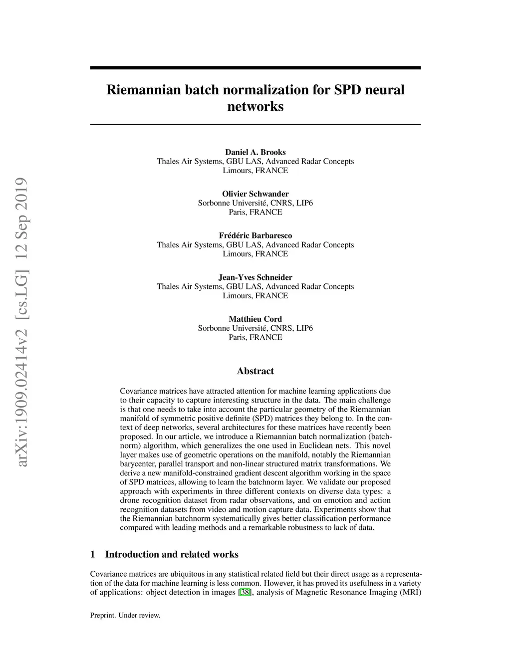 Covariance matrices have attracted attention for machine learning applications due to their capacity to capture interesting structure in the data. The main challenge is that one needs to take into account the particular geometry of the Riemannian manifold of symmetric positive definite (SPD) matrices they belong to. In the context of deep networks, several architectures for these matrices have recently been proposed. In our article, we introduce a Riemannian batch normalization (batchnorm) algorithm, which generalizes the one used in Euclidean nets. This novel layer makes use of geometric operations on the manifold, notably the Riemannian barycenter, parallel transport and non-linear structured matrix transformations. We derive a new manifold-constrained gradient descent algorithm working in the space of SPD matrices, allowing to learn the batchnorm layer. We validate our proposed approach with experiments in three different contexts on diverse data types: a drone recognition dataset from radar observations, and on emotion and action recognition datasets from video and motion capture data. Experiments show that the Riemannian batchnorm systematically gives better classification performance compared with leading methods and a remarkable robustness to lack of data.