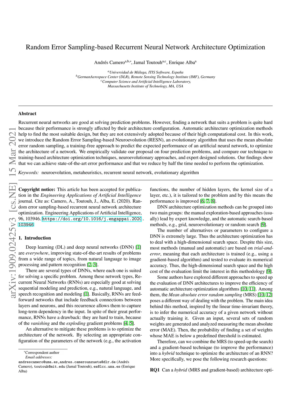 Recurrent neural networks are good at solving prediction problems. However, finding a network that suits a problem is quite hard because their performance is strongly affected by their architecture configuration. Automatic architecture optimization methods help to find the most suitable design, but they are not extensively adopted because of their high computational cost. In this work, we introduce the Random Error Sampling-based Neuroevolution (RESN), an evolutionary algorithm that uses the mean absolute error random sampling, a training-free approach to predict the expected performance of an artificial neural network, to optimize the architecture of a network. We empirically validate our proposal on three prediction problems, and compare our technique to training-based architecture optimization techniques and to neuroevolutionary approaches. Our findings show that we can achieve state-of-the-art error performance and that we reduce by half the time needed to perform the optimization.