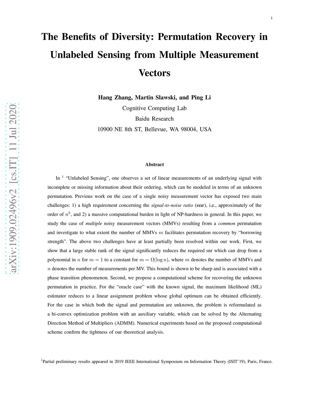 In "Unlabeled Sensing", one observes a set of linear measurements of an underlying signal with incomplete or missing information about their ordering, which can be modeled in terms of an unknown permutation. Previous work on the case of a single noisy measurement vector has exposed two main challenges: 1) a high requirement concerning the \emph{signal-to-noise ratio} (), i.e., approximately of the order of , and 2) a massive computational burden in light of NP-hardness in general. In this paper, we study the case of \emph{multiple} noisy measurement vectors (MMVs) resulting from a \emph{common} permutation and investigate to what extent the number of MMVs facilitates permutation recovery by "borrowing strength". The above two challenges have at least partially been resolved within our work. First, we show that a large stable rank of the signal significantly reduces the required snr which can drop from a polynomial in for to a constant for , where denotes the number of MMVs and denotes the number of measurements per MV. This bound is shown to be sharp and is associated with a phase transition phenomenon. Second, we propose a computational scheme for recovering the unknown permutation in practice. For the "oracle case" with the known signal, the maximum likelihood (ML) estimator reduces to a linear assignment problem whose global optimum can be obtained efficiently. For the case in which both the signal and permutation are unknown, the problem is reformulated as a bi-convex optimization problem with an auxiliary variable, which can be solved by the Alternating Direction Method of Multipliers (ADMM). Numerical experiments based on the proposed computational scheme confirm the tightness of our theoretical analysis.