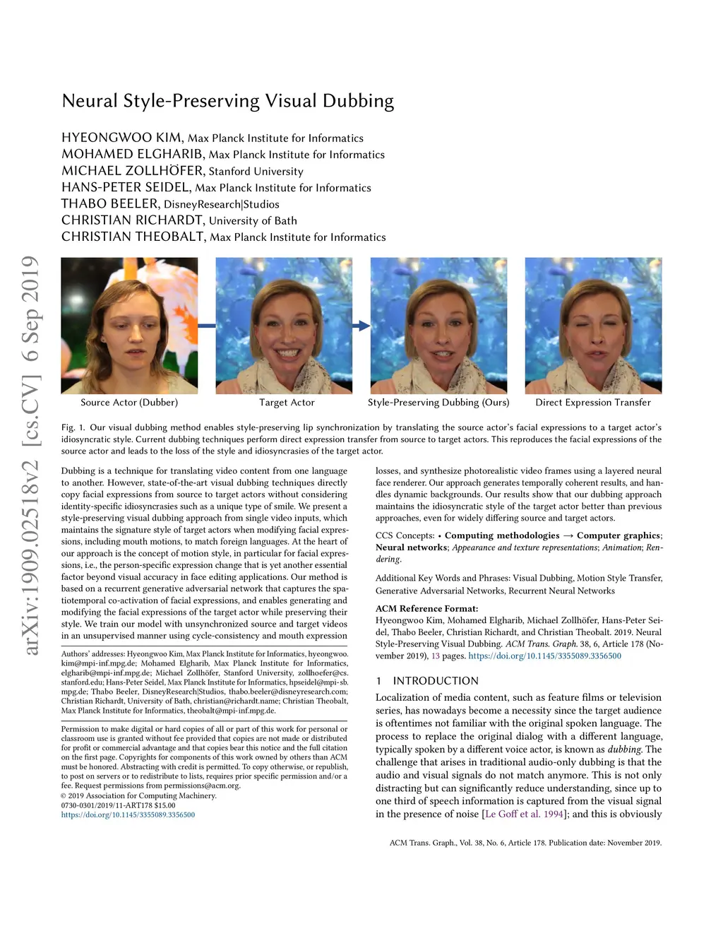 Dubbing is a technique for translating video content from one language to another. However, state-of-the-art visual dubbing techniques directly copy facial expressions from source to target actors without considering identity-specific idiosyncrasies such as a unique type of smile. We present a style-preserving visual dubbing approach from single video inputs, which maintains the signature style of target actors when modifying facial expressions, including mouth motions, to match foreign languages. At the heart of our approach is the concept of motion style, in particular for facial expressions, i.e., the person-specific expression change that is yet another essential factor beyond visual accuracy in face editing applications. Our method is based on a recurrent generative adversarial network that captures the spatiotemporal co-activation of facial expressions, and enables generating and modifying the facial expressions of the target actor while preserving their style. We train our model with unsynchronized source and target videos in an unsupervised manner using cycle-consistency and mouth expression losses, and synthesize photorealistic video frames using a layered neural face renderer. Our approach generates temporally coherent results, and handles dynamic backgrounds. Our results show that our dubbing approach maintains the idiosyncratic style of the target actor better than previous approaches, even for widely differing source and target actors.