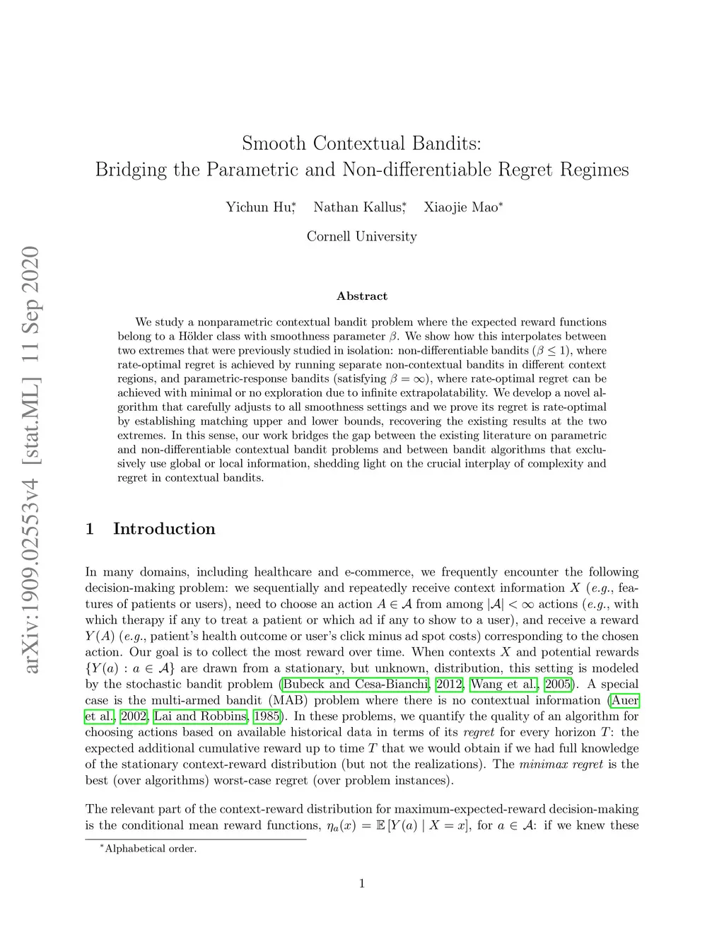 We study a nonparametric contextual bandit problem where the expected reward functions belong to a H\"older class with smoothness parameter . We show how this interpolates between two extremes that were previously studied in isolation: non-differentiable bandits (), where rate-optimal regret is achieved by running separate non-contextual bandits in different context regions, and parametric-response bandits (satisfying ), where rate-optimal regret can be achieved with minimal or no exploration due to infinite extrapolatability. We develop a novel algorithm that carefully adjusts to all smoothness settings and we prove its regret is rate-optimal by establishing matching upper and lower bounds, recovering the existing results at the two extremes. In this sense, our work bridges the gap between the existing literature on parametric and non-differentiable contextual bandit problems and between bandit algorithms that exclusively use global or local information, shedding light on the crucial interplay of complexity and regret in contextual bandits.
