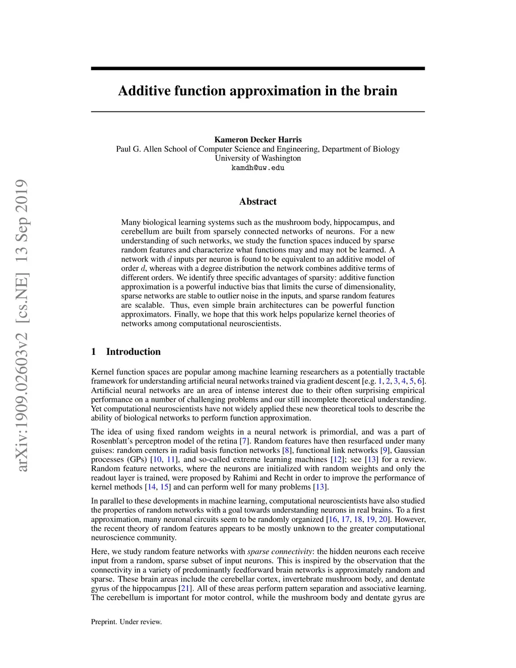 Many biological learning systems such as the mushroom body, hippocampus, and cerebellum are built from sparsely connected networks of neurons. For a new understanding of such networks, we study the function spaces induced by sparse random features and characterize what functions may and may not be learned. A network with inputs per neuron is found to be equivalent to an additive model of order , whereas with a degree distribution the network combines additive terms of different orders. We identify three specific advantages of sparsity: additive function approximation is a powerful inductive bias that limits the curse of dimensionality, sparse networks are stable to outlier noise in the inputs, and sparse random features are scalable. Thus, even simple brain architectures can be powerful function approximators. Finally, we hope that this work helps popularize kernel theories of networks among computational neuroscientists.