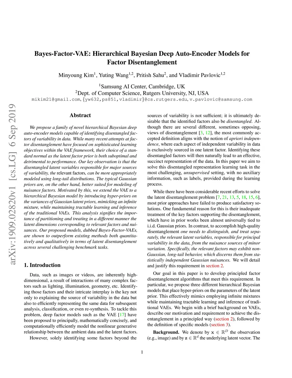 We propose a family of novel hierarchical Bayesian deep auto-encoder models capable of identifying disentangled factors of variability in data. While many recent attempts at factor disentanglement have focused on sophisticated learning objectives within the VAE framework, their choice of a standard normal as the latent factor prior is both suboptimal and detrimental to performance. Our key observation is that the disentangled latent variables responsible for major sources of variability, the relevant factors, can be more appropriately modeled using long-tail distributions. The typical Gaussian priors are, on the other hand, better suited for modeling of nuisance factors. Motivated by this, we extend the VAE to a hierarchical Bayesian model by introducing hyper-priors on the variances of Gaussian latent priors, mimicking an infinite mixture, while maintaining tractable learning and inference of the traditional VAEs. This analysis signifies the importance of partitioning and treating in a different manner the latent dimensions corresponding to relevant factors and nuisances. Our proposed models, dubbed Bayes-Factor-VAEs, are shown to outperform existing methods both quantitatively and qualitatively in terms of latent disentanglement across several challenging benchmark tasks.