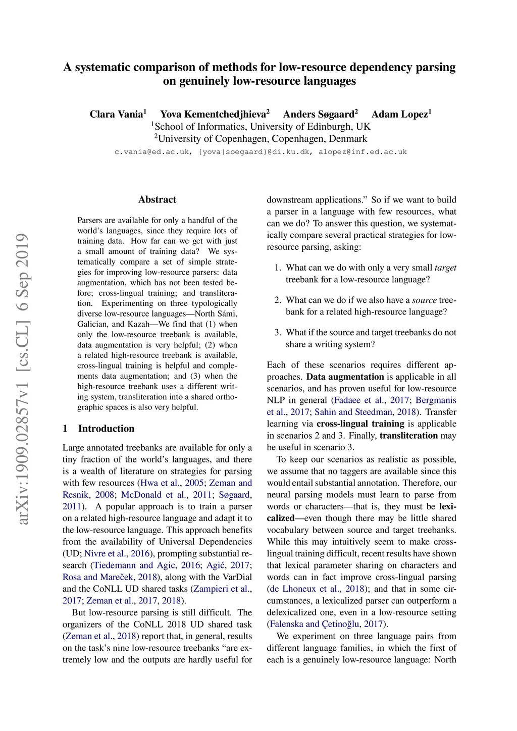 Parsers are available for only a handful of the world's languages, since they require lots of training data. How far can we get with just a small amount of training data? We systematically compare a set of simple strategies for improving low-resource parsers: data augmentation, which has not been tested before; cross-lingual training; and transliteration. Experimenting on three typologically diverse low-resource languages---North S\ámi, Galician, and Kazah---We find that (1) when only the low-resource treebank is available, data augmentation is very helpful; (2) when a related high-resource treebank is available, cross-lingual training is helpful and complements data augmentation; and (3) when the high-resource treebank uses a different writing system, transliteration into a shared orthographic spaces is also very helpful.