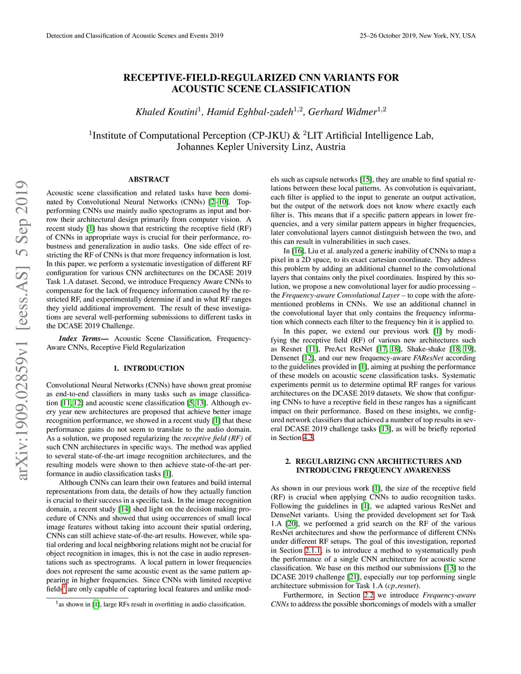 Acoustic scene classification and related tasks have been dominated by Convolutional Neural Networks (CNNs). Top-performing CNNs use mainly audio spectograms as input and borrow their architectural design primarily from computer vision. A recent study has shown that restricting the receptive field (RF) of CNNs in appropriate ways is crucial for their performance, robustness and generalization in audio tasks. One side effect of restricting the RF of CNNs is that more frequency information is lost. In this paper, we perform a systematic investigation of different RF configuration for various CNN architectures on the DCASE 2019 Task 1.A dataset. Second, we introduce Frequency Aware CNNs to compensate for the lack of frequency information caused by the restricted RF, and experimentally determine if and in what RF ranges they yield additional improvement. The result of these investigations are several well-performing submissions to different tasks in the DCASE 2019 Challenge.