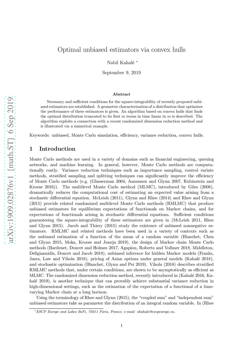Necessary and sufficient conditions for the square-integrability of recently proposed unbiased estimators are established. A geometric characterization of a distribution that optimizes the performance of these estimators is given. An algorithm based on convex hulls that finds the optimal distribution truncated to its first m terms in time linear in m is described. The algorithm exploits a connection with a recent randomized dimension reduction method and is illustrated via a numerical example.