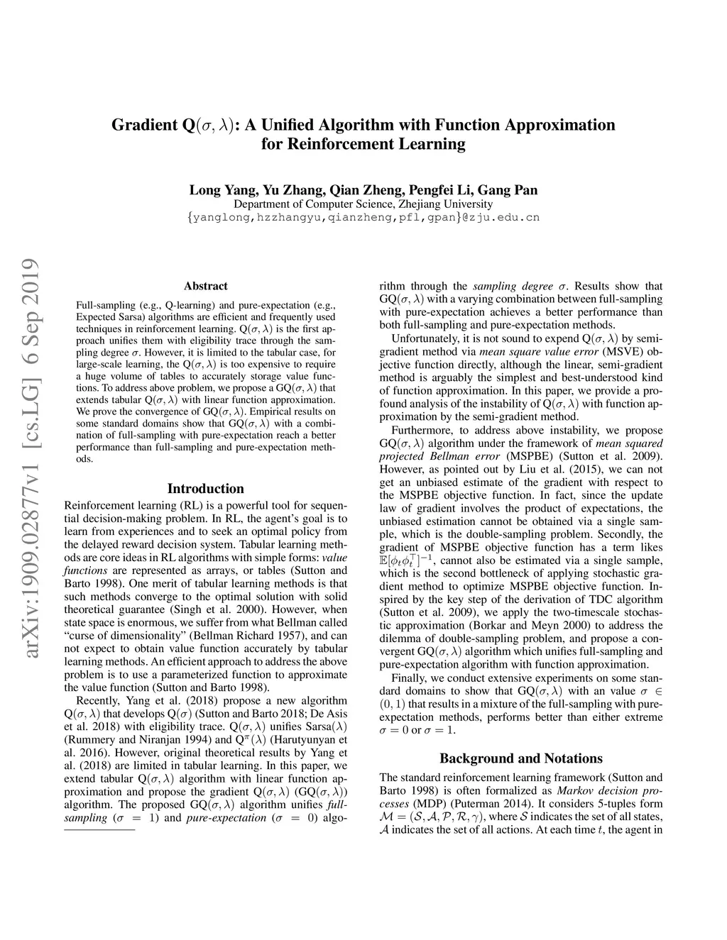 Full-sampling (e.g., Q-learning) and pure-expectation (e.g., Expected Sarsa) algorithms are efficient and frequently used techniques in reinforcement learning. Q is the first approach unifies them with eligibility trace through the sampling degree . However, it is limited to the tabular case, for large-scale learning, the Q is too expensive to require a huge volume of tables to accurately storage value functions. To address above problem, we propose a GQ that extends tabular Q with linear function approximation. We prove the convergence of GQ. Empirical results on some standard domains show that GQ with a combination of full-sampling with pure-expectation reach a better performance than full-sampling and pure-expectation methods.