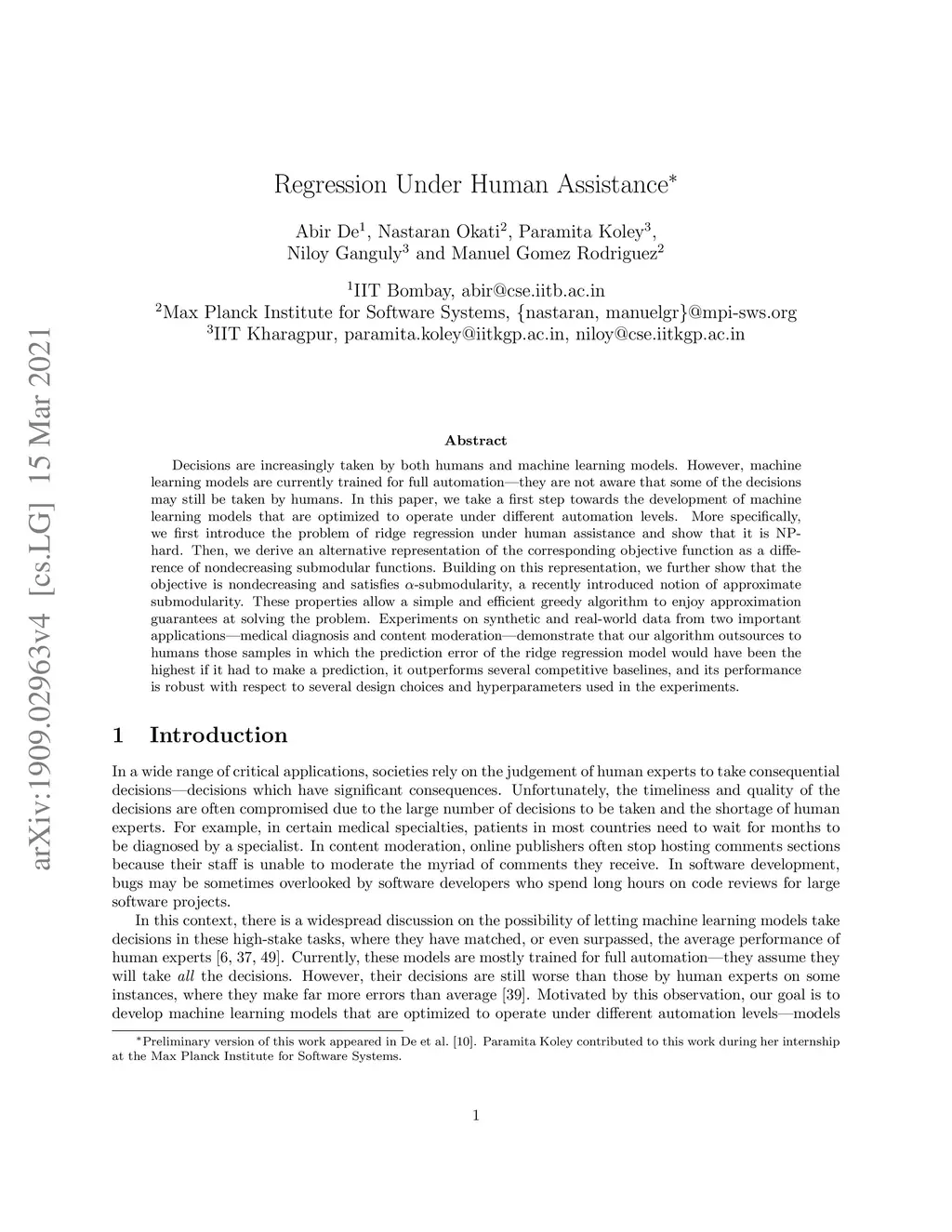 Decisions are increasingly taken by both humans and machine learning models. However, machine learning models are currently trained for full automation -- they are not aware that some of the decisions may still be taken by humans. In this paper, we take a first step towards the development of machine learning models that are optimized to operate under different automation levels. More specifically, we first introduce the problem of ridge regression under human assistance and show that it is NP-hard. Then, we derive an alternative representation of the corresponding objective function as a difference of nondecreasing submodular functions. Building on this representation, we further show that the objective is nondecreasing and satisfies -submodularity, a recently introduced notion of approximate submodularity. These properties allow a simple and efficient greedy algorithm to enjoy approximation guarantees at solving the problem. Experiments on synthetic and real-world data from two important applications -- medical diagnosis and content moderation-demonstrate that our algorithm outsources to humans those samples in which the prediction error of the ridge regression model would have been the highest if it had to make a prediction, it outperforms several competitive baselines, and its performance is robust with respect to several design choices and hyperparameters used in the experiments.