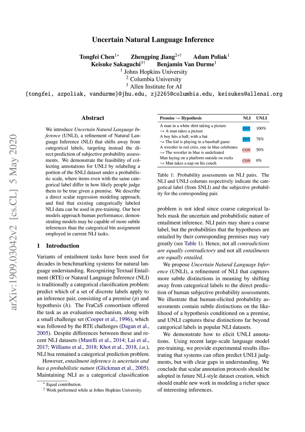 We introduce Uncertain Natural Language Inference (UNLI), a refinement of Natural Language Inference (NLI) that shifts away from categorical labels, targeting instead the direct prediction of subjective probability assessments. We demonstrate the feasibility of collecting annotations for UNLI by relabeling a portion of the SNLI dataset under a probabilistic scale, where items even with the same categorical label differ in how likely people judge them to be true given a premise. We describe a direct scalar regression modeling approach, and find that existing categorically labeled NLI data can be used in pre-training. Our best models approach human performance, demonstrating models may be capable of more subtle inferences than the categorical bin assignment employed in current NLI tasks.