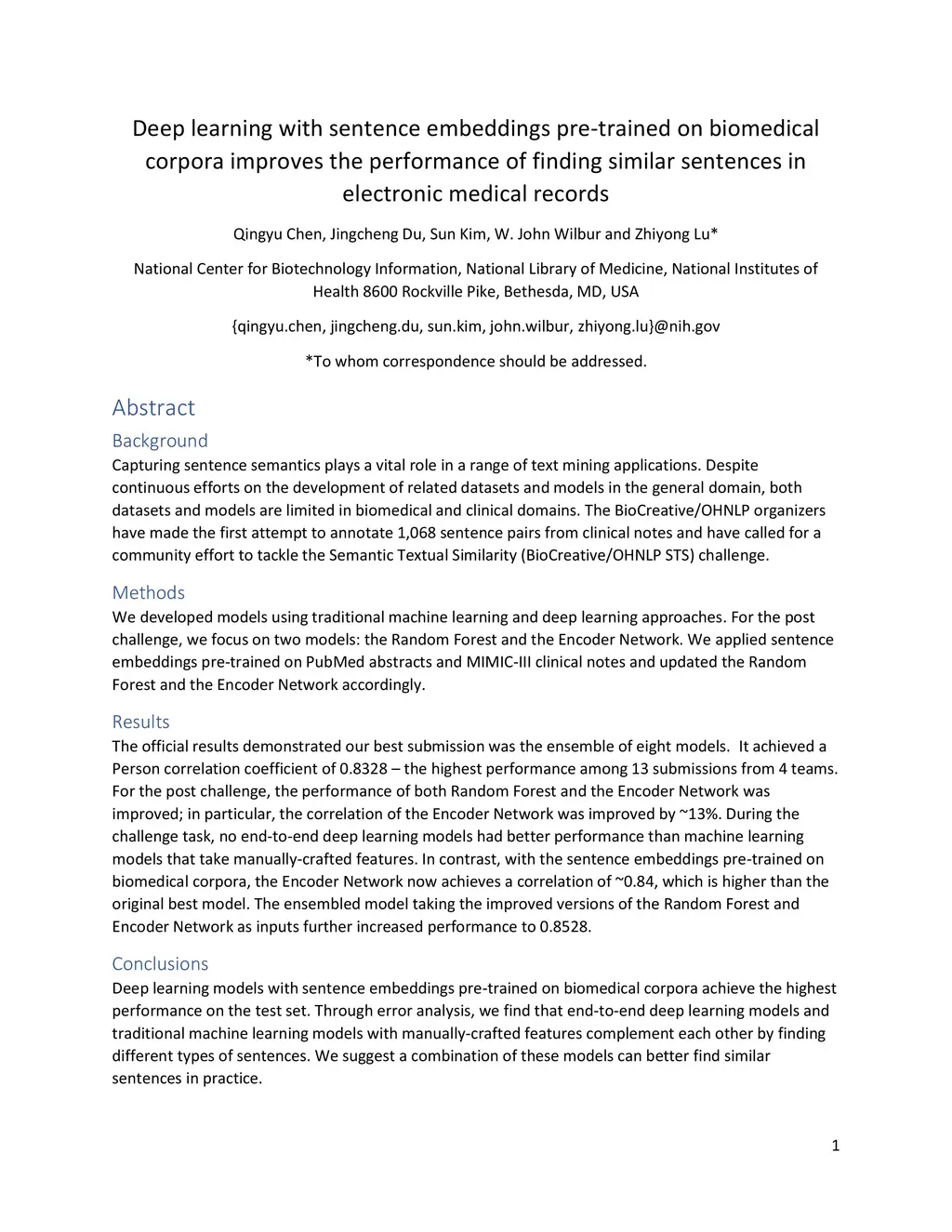 Deep learning with sentence embeddings pre-trained on biomedical corpora