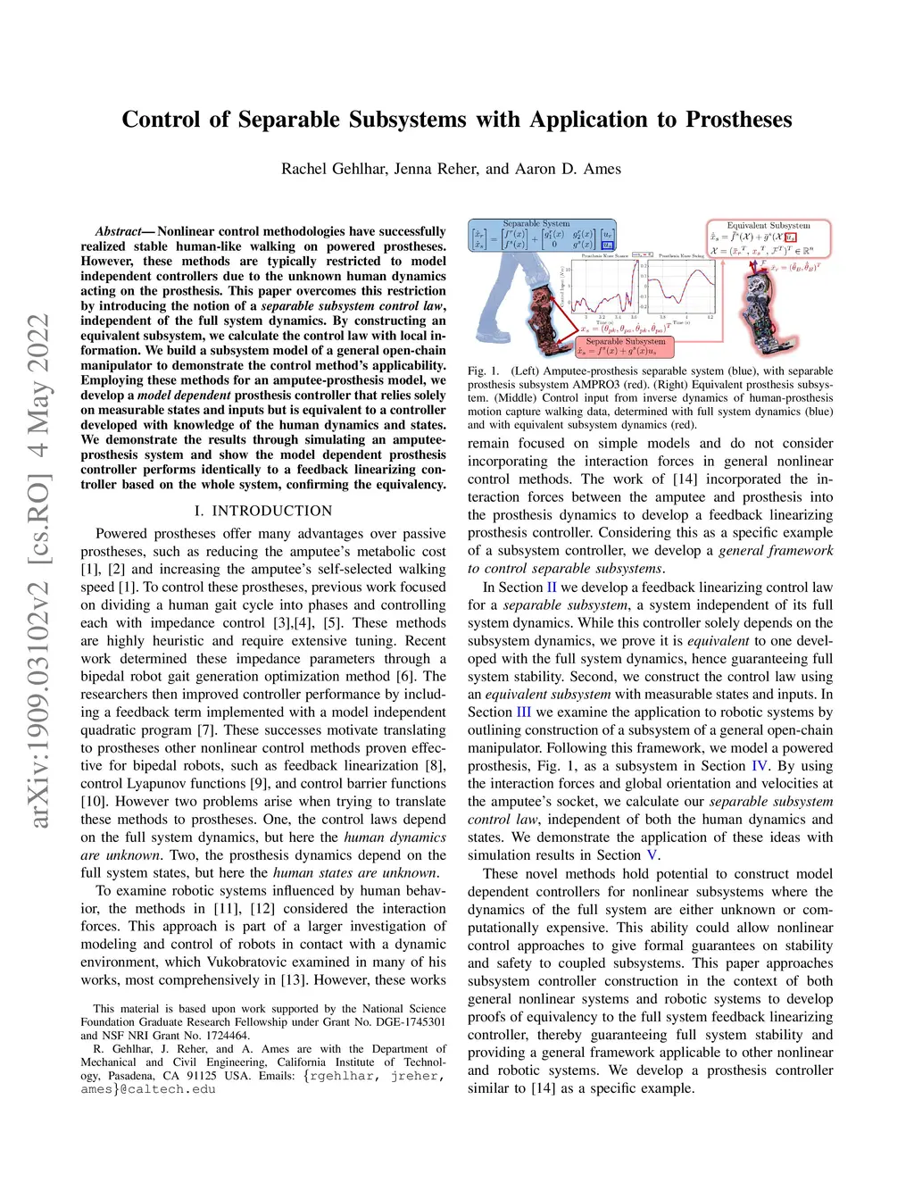 Control of Separable Subsystems with Application to Prostheses