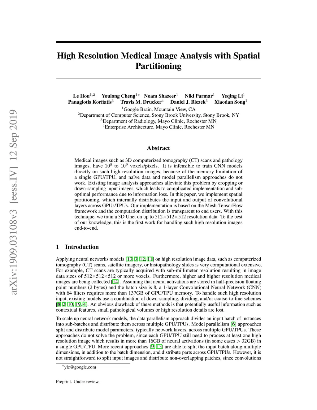 Medical images such as 3D computerized tomography (CT) scans and pathology images, have hundreds of millions or billions of voxels/pixels. It is infeasible to train CNN models directly on such high resolution images, because neural activations of a single image do not fit in the memory of a single GPU/TPU, and naive data and model parallelism approaches do not work. Existing image analysis approaches alleviate this problem by cropping or down-sampling input images, which leads to complicated implementation and sub-optimal performance due to information loss. In this paper, we implement spatial partitioning, which internally distributes the input and output of convolutional layers across GPUs/TPUs. Our implementation is based on the Mesh-TensorFlow framework and the computation distribution is transparent to end users. With this technique, we train a 3D Unet on up to 512 by 512 by 512 resolution data. To the best of our knowledge, this is the first work for handling such high resolution images end-to-end.