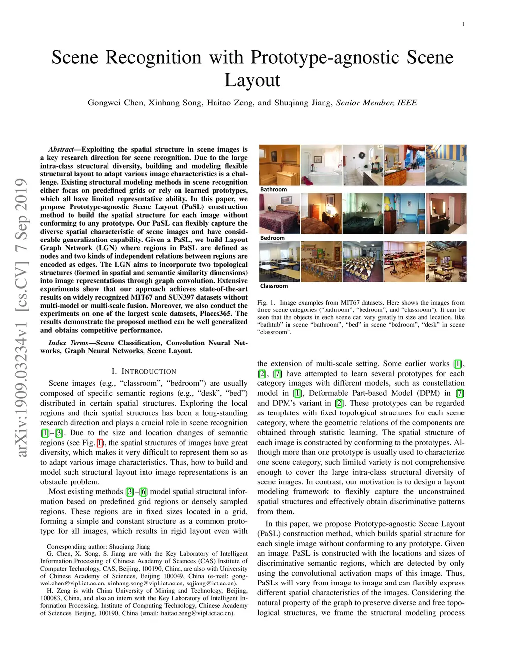 Abstract--- Exploiting the spatial structure in scene images is a key research direction for scene recognition. Due to the large intra-class structural diversity, building and modeling flexible structural layout to adapt various image characteristics is a challenge. Existing structural modeling methods in scene recognition either focus on predefined grids or rely on learned prototypes, which all have limited representative ability. In this paper, we propose Prototype-agnostic Scene Layout (PaSL) construction method to build the spatial structure for each image without conforming to any prototype. Our PaSL can flexibly capture the diverse spatial characteristic of scene images and have considerable generalization capability. Given a PaSL, we build Layout Graph Network (LGN) where regions in PaSL are defined as nodes and two kinds of independent relations between regions are encoded as edges. The LGN aims to incorporate two topological structures (formed in spatial and semantic similarity dimensions) into image representations through graph convolution. Extensive experiments show that our approach achieves state-of-the-art results on widely recognized MIT67 and SUN397 datasets without multi-model or multi-scale fusion. Moreover, we also conduct the experiments on one of the largest scale datasets, Places365. The results demonstrate the proposed method can be well generalized and obtains competitive performance.