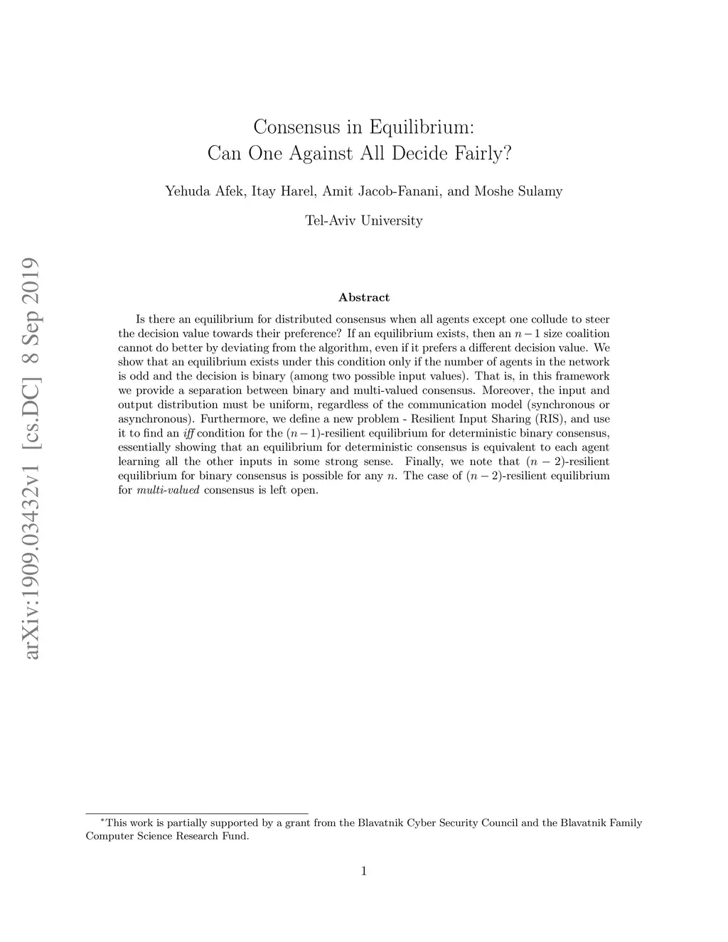 Is there an equilibrium for distributed consensus when all agents except one collude to steer the decision value towards their preference? If an equilibrium exists, then an size coalition cannot do better by deviating from the algorithm, even if it prefers a different decision value. We show that an equilibrium exists under this condition only if the number of agents in the network is odd and the decision is binary (among two possible input values). That is, in this framework we provide a separation between binary and multi-valued consensus. Moreover, the input and output distribution must be uniform, regardless of the communication model (synchronous or asynchronous). Furthermore, we define a new problem - Resilient Input Sharing (RIS), and use it to find an {\em iff} condition for the -resilient equilibrium for deterministic binary consensus, essentially showing that an equilibrium for deterministic consensus is equivalent to each agent learning all the other inputs in some strong sense. Finally, we note that -resilient equilibrium for binary consensus is possible for any . The case of -resilient equilibrium for \emph{multi-valued} consensus is left open.