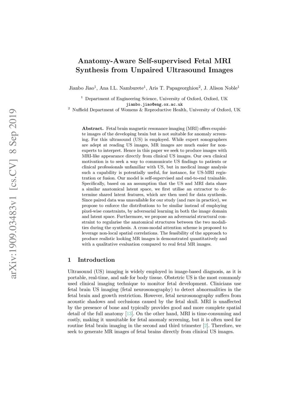 Fetal brain magnetic resonance imaging (MRI) offers exquisite images of the developing brain but is not suitable for anomaly screening. For this ultrasound (US) is employed. While expert sonographers are adept at reading US images, MR images are much easier for non-experts to interpret. Hence in this paper we seek to produce images with MRI-like appearance directly from clinical US images. Our own clinical motivation is to seek a way to communicate US findings to patients or clinical professionals unfamiliar with US, but in medical image analysis such a capability is potentially useful, for instance, for US-MRI registration or fusion. Our model is self-supervised and end-to-end trainable. Specifically, based on an assumption that the US and MRI data share a similar anatomical latent space, we first utilise an extractor to determine shared latent features, which are then used for data synthesis. Since paired data was unavailable for our study (and rare in practice), we propose to enforce the distributions to be similar instead of employing pixel-wise constraints, by adversarial learning in both the image domain and latent space. Furthermore, we propose an adversarial structural constraint to regularise the anatomical structures between the two modalities during the synthesis. A cross-modal attention scheme is proposed to leverage non-local spatial correlations. The feasibility of the approach to produce realistic looking MR images is demonstrated quantitatively and with a qualitative evaluation compared to real fetal MR images.