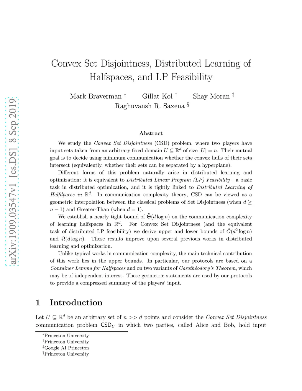 We study the Convex Set Disjointness (CSD) problem, where two players have input sets taken from an arbitrary fixed domain~ of size . Their mutual goal is to decide using minimum communication whether the convex hulls of their sets intersect (equivalently, whether their sets can be separated by a hyperplane). Different forms of this problem naturally arise in distributed learning and optimization: it is equivalent to {\em Distributed Linear Program (LP) Feasibility} -- a basic task in distributed optimization, and it is tightly linked to {\it Distributed Learning of Halfdpaces in }. In {communication complexity theory}, CSD can be viewed as a geometric interpolation between the classical problems of {Set Disjointness} (when~) and {Greater-Than} (when ). We establish a nearly tight bound of on the communication complexity of learning halfspaces in . For Convex Set Disjointness (and the equivalent task of distributed LP feasibility) we derive upper and lower bounds of and~. These results improve upon several previous works in distributed learning and optimization. Unlike typical works in communication complexity, the main technical contribution of this work lies in the upper bounds. In particular, our protocols are based on a {\it Container Lemma for Halfspaces} and on two variants of {\it Carath\éodory's Theorem}, which may be of independent interest. These geometric statements are used by our protocols to provide a compressed summary of the players' input.