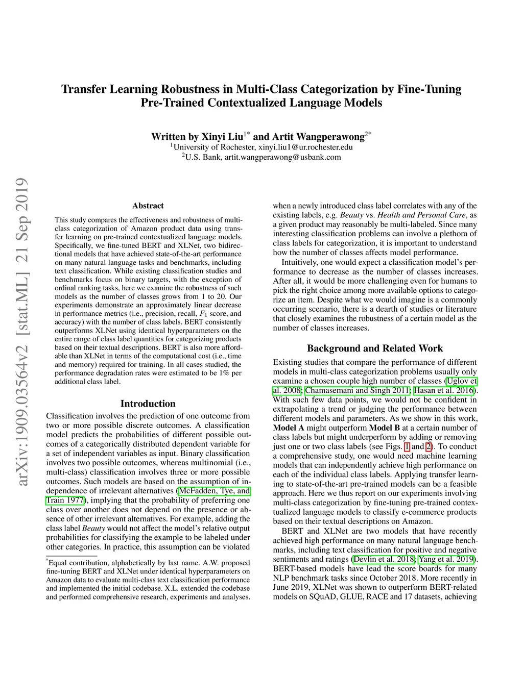 This study compares the effectiveness and robustness of multi-class categorization of Amazon product data using transfer learning on pre-trained contextualized language models. Specifically, we fine-tuned BERT and XLNet, two bidirectional models that have achieved state-of-the-art performance on many natural language tasks and benchmarks, including text classification. While existing classification studies and benchmarks focus on binary targets, with the exception of ordinal ranking tasks, here we examine the robustness of such models as the number of classes grows from 1 to 20. Our experiments demonstrate an approximately linear decrease in performance metrics (i.e., precision, recall, score, and accuracy) with the number of class labels. BERT consistently outperforms XLNet using identical hyperparameters on the entire range of class label quantities for categorizing products based on their textual descriptions. BERT is also more affordable than XLNet in terms of the computational cost (i.e., time and memory) required for training. In all cases studied, the performance degradation rates were estimated to be 1% per additional class label.
