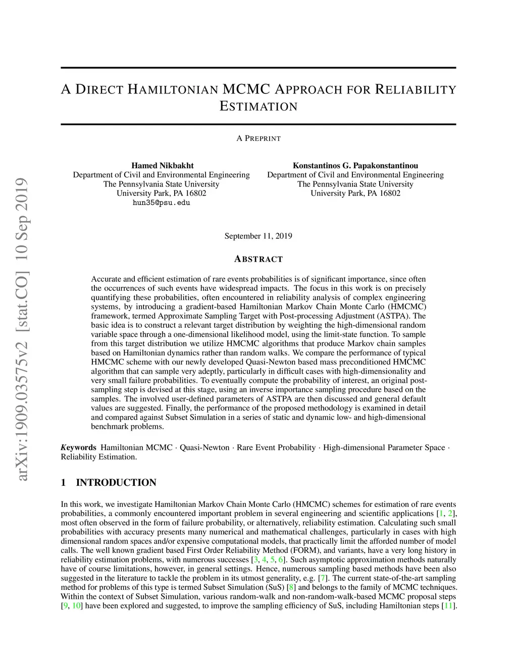 Accurate and efficient estimation of rare events probabilities is of significant importance, since often the occurrences of such events have widespread impacts. The focus in this work is on precisely quantifying these probabilities, often encountered in reliability analysis of complex engineering systems, by introducing a gradient-based Hamiltonian Markov Chain Monte Carlo (HMCMC) framework, termed Approximate Sampling Target with Post-processing Adjustment (ASTPA). The basic idea is to construct a relevant target distribution by weighting the high-dimensional random variable space through a one-dimensional likelihood model, using the limit-state function. To sample from this target distribution we utilize HMCMC algorithms that produce Markov chain samples based on Hamiltonian dynamics rather than random walks. We compare the performance of typical HMCMC scheme with our newly developed Quasi-Newton based mass preconditioned HMCMC algorithm that can sample very adeptly, particularly in difficult cases with high-dimensionality and very small failure probabilities. To eventually compute the probability of interest, an original post-sampling step is devised at this stage, using an inverse importance sampling procedure based on the samples. The involved user-defined parameters of ASTPA are then discussed and general default values are suggested. Finally, the performance of the proposed methodology is examined in detail and compared against Subset Simulation in a series of static and dynamic low- and high-dimensional benchmark problems.