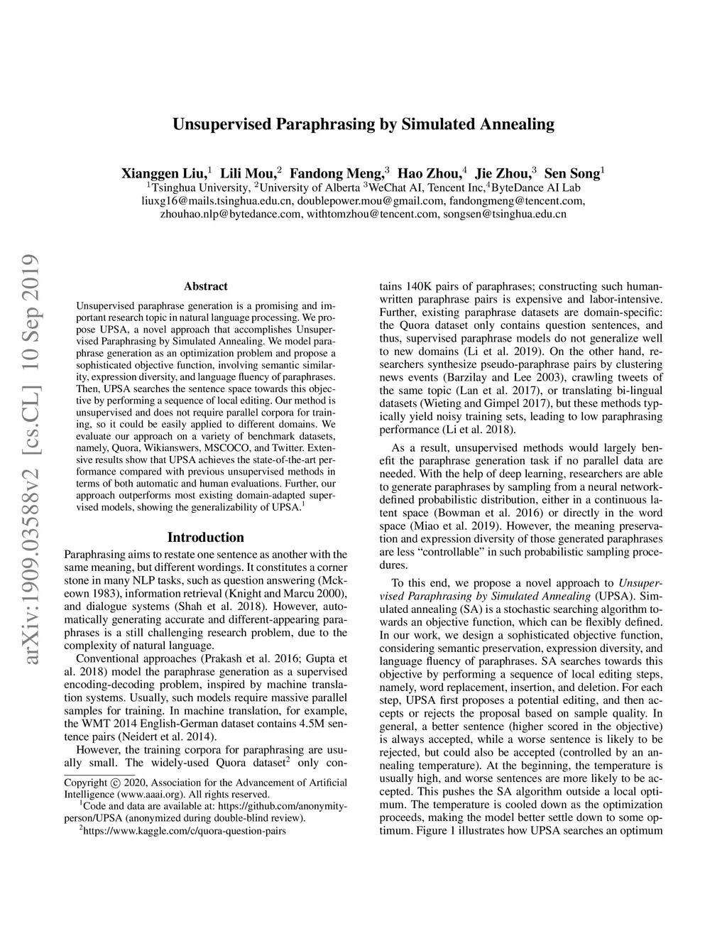 Unsupervised paraphrase generation is a promising and important research topic in natural language processing. We propose UPSA, a novel approach that accomplishes Unsupervised Paraphrasing by Simulated Annealing. We model paraphrase generation as an optimization problem and propose a sophisticated objective function, involving semantic similarity, expression diversity, and language fluency of paraphrases. Then, UPSA searches the sentence space towards this objective by performing a sequence of local editing. Our method is unsupervised and does not require parallel corpora for training, so it could be easily applied to different domains. We evaluate our approach on a variety of benchmark datasets, namely, Quora, Wikianswers, MSCOCO, and Twitter. Extensive results show that UPSA achieves the state-of-the-art performance compared with previous unsupervised methods in terms of both automatic and human evaluations. Further, our approach outperforms most existing domain-adapted supervised models, showing the generalizability of UPSA.