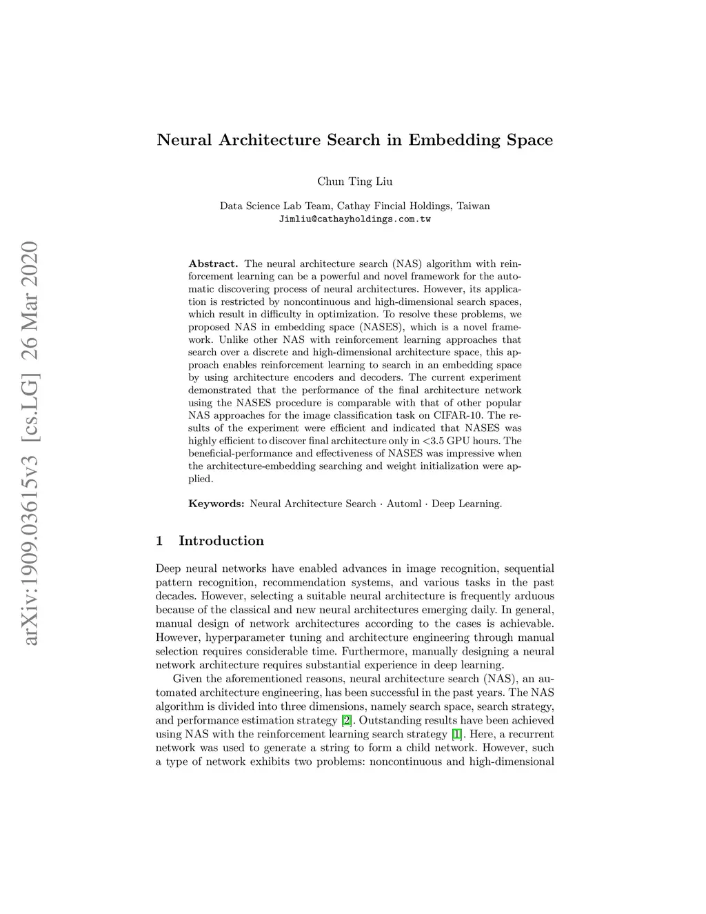 The neural architecture search (NAS) algorithm with reinforcement learning can be a powerful and novel framework for the automatic discovering process of neural architectures. However, its application is restricted by noncontinuous and high-dimensional search spaces, which result in difficulty in optimization. To resolve these problems, we proposed NAS in embedding space (NASES), which is a novel framework. Unlike other NAS with reinforcement learning approaches that search over a discrete and high-dimensional architecture space, this approach enables reinforcement learning to search in an embedding space by using architecture encoders and decoders. The current experiment demonstrated that the performance of the final architecture network using the NASES procedure is comparable with that of other popular NAS approaches for the image classification task on CIFAR-10. The results of the experiment were efficient and indicated that NASES was highly efficient to discover final architecture only in 3.5 GPU hours. The beneficial-performance and effectiveness of NASES was impressive when the architecture-embedding searching and weight initialization were applied.